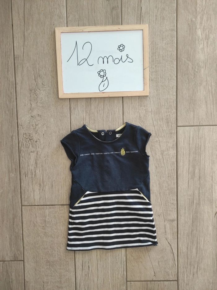 Robe bleue IKKS en taille 12 mois avec ananas ✅ Pour filtrer par taille : aller dans "chercher" puis taper mon pseudo et mettre les filtres souhaités ✅ Réduction automatique dès 5 articles ✅ Négociation possible sur les lots