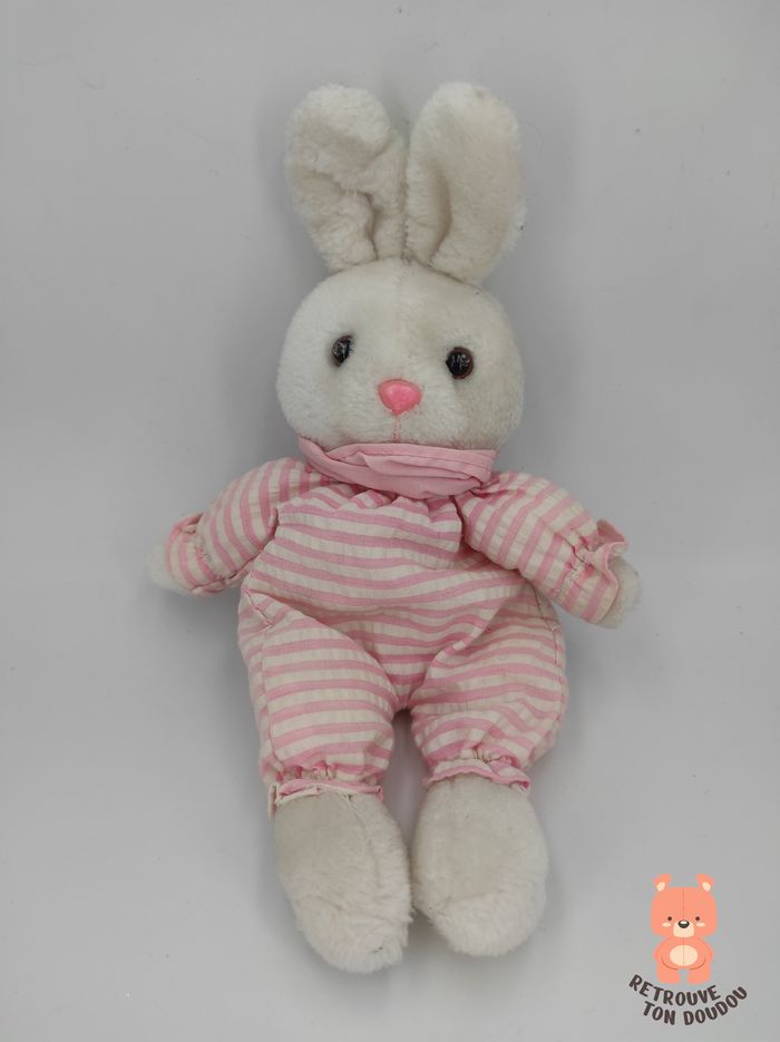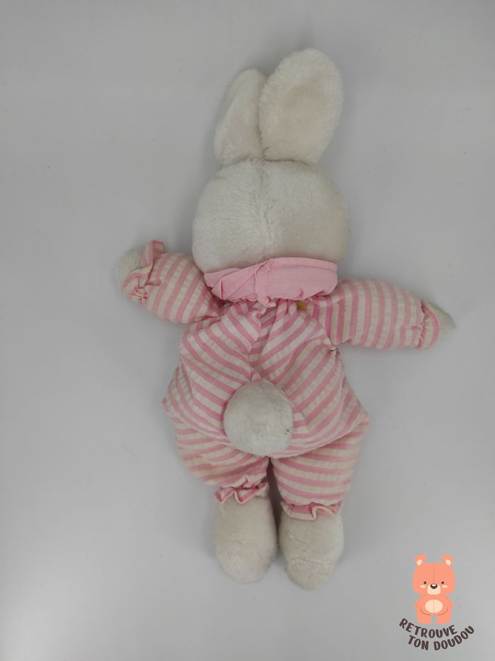 🐰 Doudou Peluche Lapin Blanc avec tissu rayé rose, nez rose, collerette rose, Bumpkins, vintage années fin 80e début 90' 📏 Dimension : 27 cm environ ✨ État : Occasion, bon état, dans son jus, les yeux et le nez sont très rayés 🧼 Non lavé 👀 Vous achetez le doudou que vous voyez sur les photos.