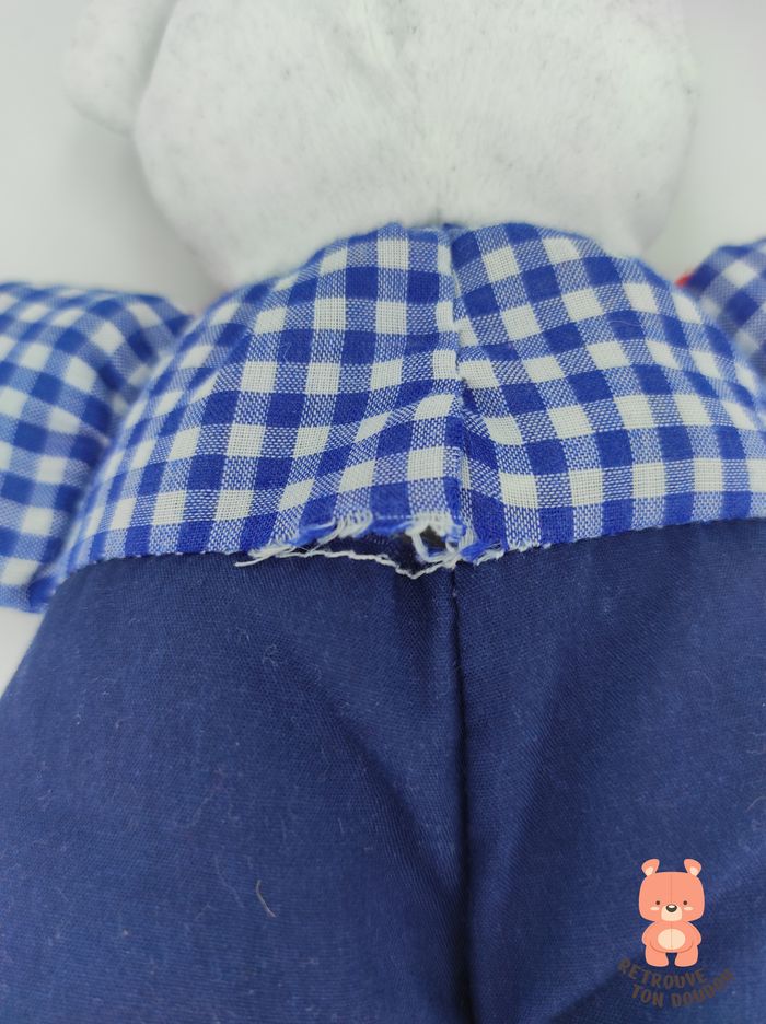 🐻‍❄️ Doudou ours blanc, tissu à carreaux vichy blanc et bleu, bretelles rouge, pantalon bleu marine, brodé A B C. Il contient un grelot comme un hochet. Simpson Trading 📏 Dimension : 23 cm environ assis ✨ État : Occasion, bon état, abîmé au niveau des bretelles et décousu à l'arrière 🧼 Lavé avec lessive hypoallergénique 👀 Vous achetez le doudou que vous voyez sur les photos.