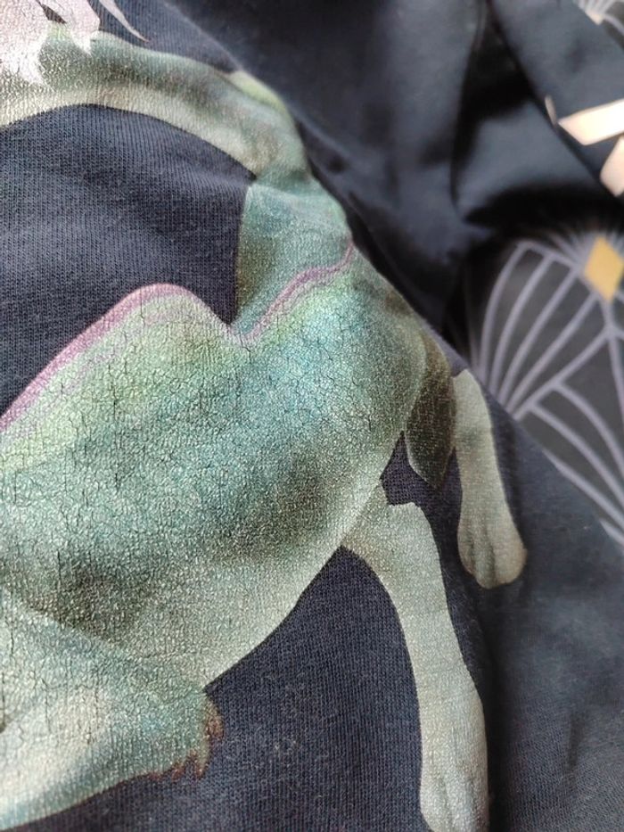 Bien porté mais encore en tres bon état Le dessin a craqué suite aux nombreux lavages (toujours à l'envers) mais il ne d'effrite pas voir photos