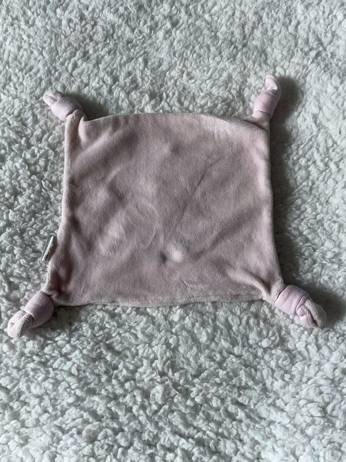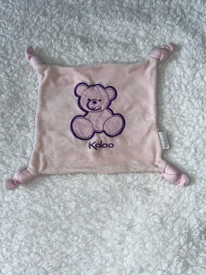 Doudou plat mouchoir rose En broderie un ours ourson au fil violet 4 noeuds aux extrémités Kaloo Occasion en très bon état Vous achetez le doudou que vous voyez sur la photo