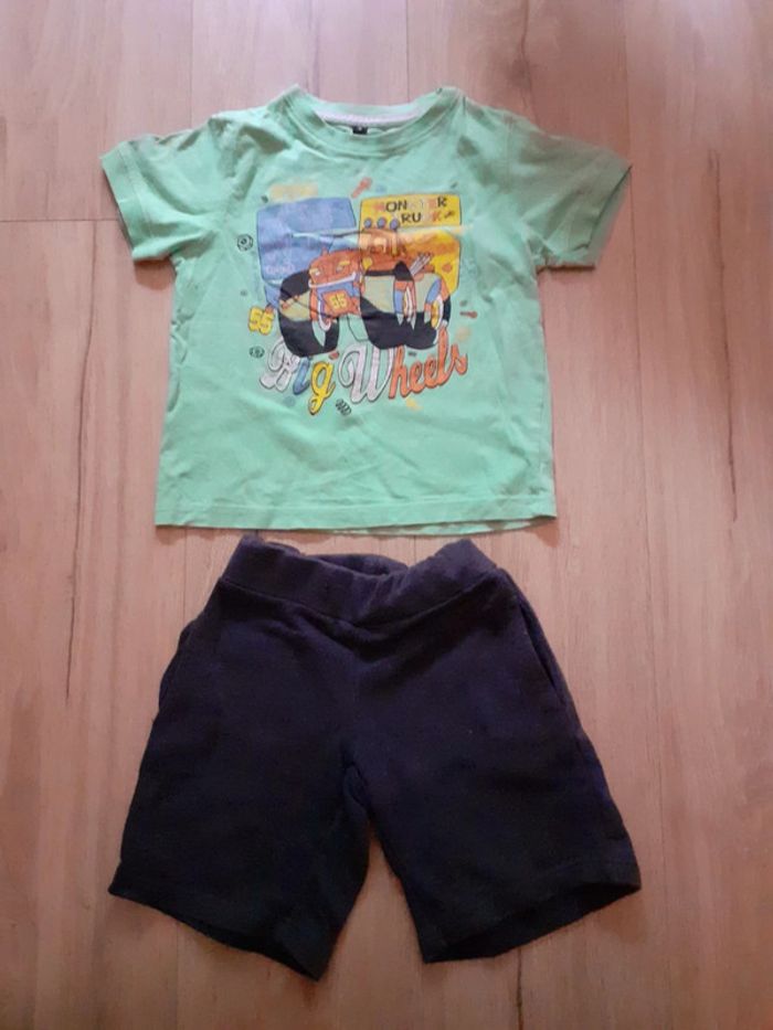 T-shirt + short : • Tee-shirt - Bestway - vert - Monster Truck Big Wheels - 4 ans • Short - Newco - gris foncé - tout petit trou à l'arrière (photo) - 4 ans 4 ans #sandrinelpg_4ans #sandrinelpg_enfant