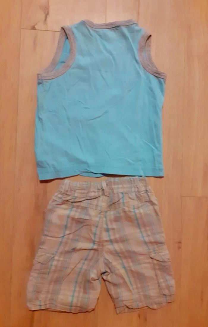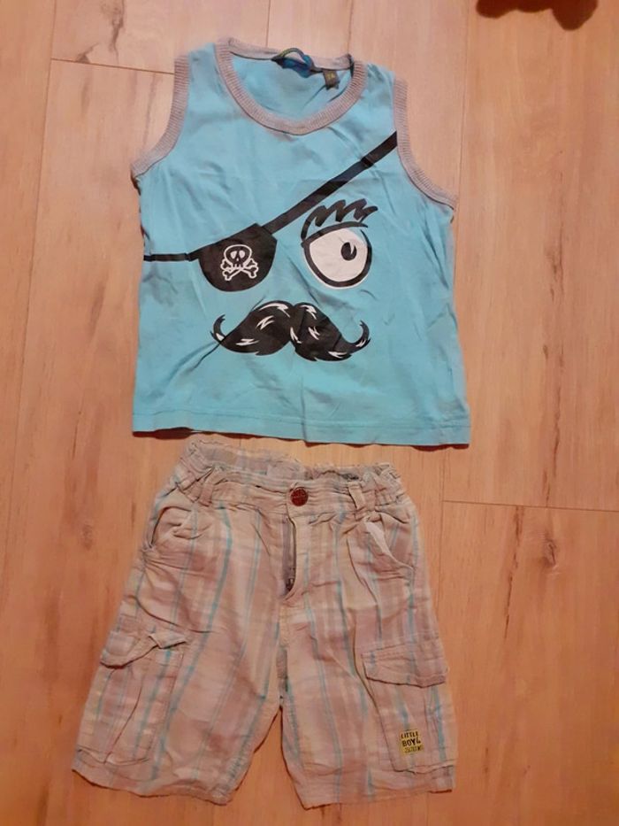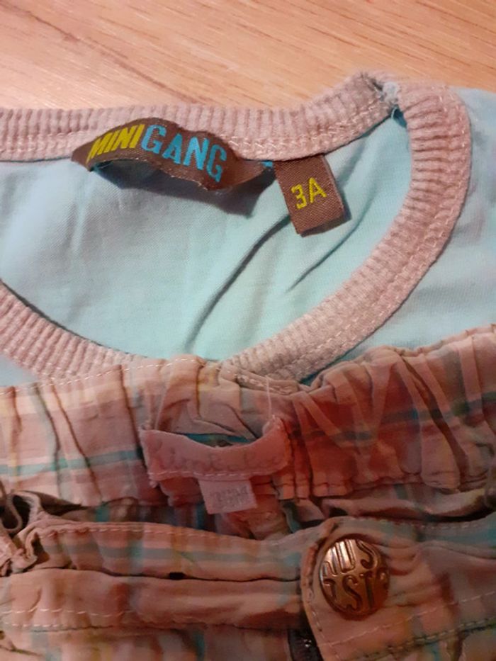 T-shirt + short - 3 ans : • Tee-shirt - Mini Gang - bleu - pirate et moustaches - 3 ans - petit accroc dans le dos (photo) • Short à carreaux - blanc/bleu/gris - Kimbaloo - taille ajustable avec boutons et élastique - 3 ans #sandrinelpg_3ans #sandrinelpg_enfant