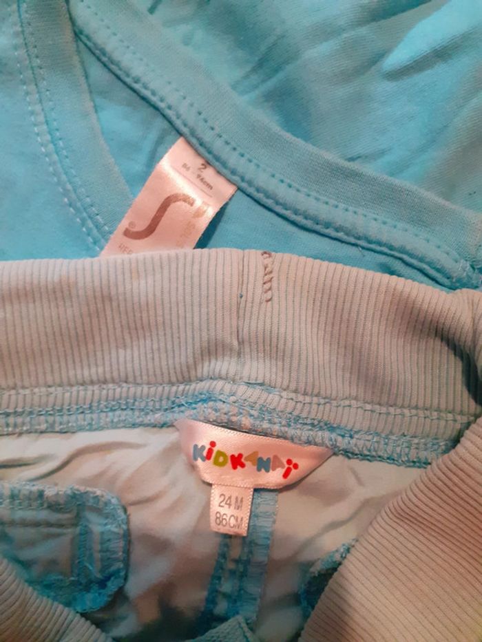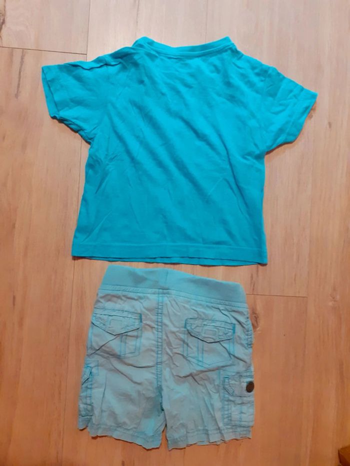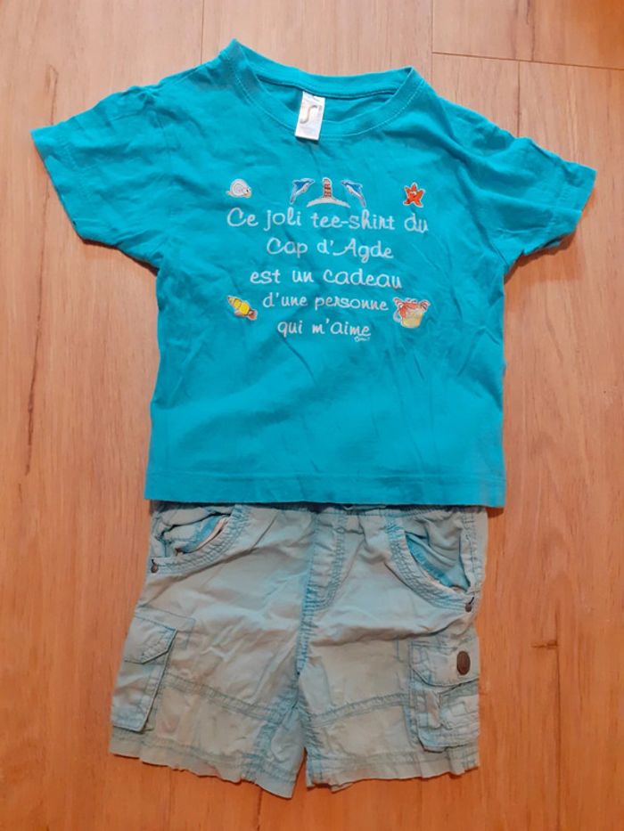 • T-shirt - Cap d'Agde - bleu ciel - 2 ans - 86/94 cm • Short - Kid Kanaï - bleu - 6 poches - cordon à la ceinture - trace d'usure sur une poche arrière (photo) - 24 mois - 86 cm #sandrinelpg_2ans #sandrinelpg_enfant