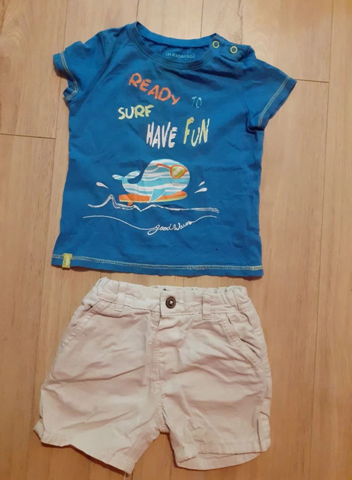 • T-shirt bleu - thème marin - Ready to surf have fun - In extenso - minuscule accroc en bas à gauche (photo) - 86 cm