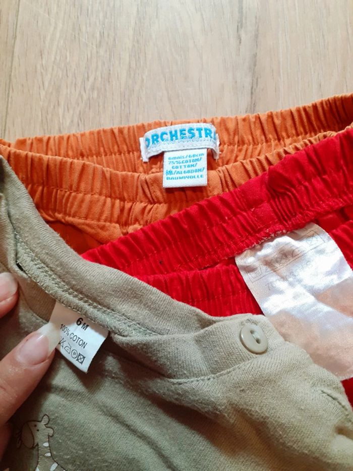 Ensemble : • Short orange - taille élastique - 6 poches - Orchestra - 6 mois - 68 cm • Short rouge - taille élastique - 2 poches latérales (couleur un tout petit moins vive dans la réalité) - 6 mois • tee-shirt kaki/blanc - Authentic aventure - Animal designs African - petite poche ventrale - 6 mois En très bon état #sandrinelpg_6mois #sandrinelpg_bebe