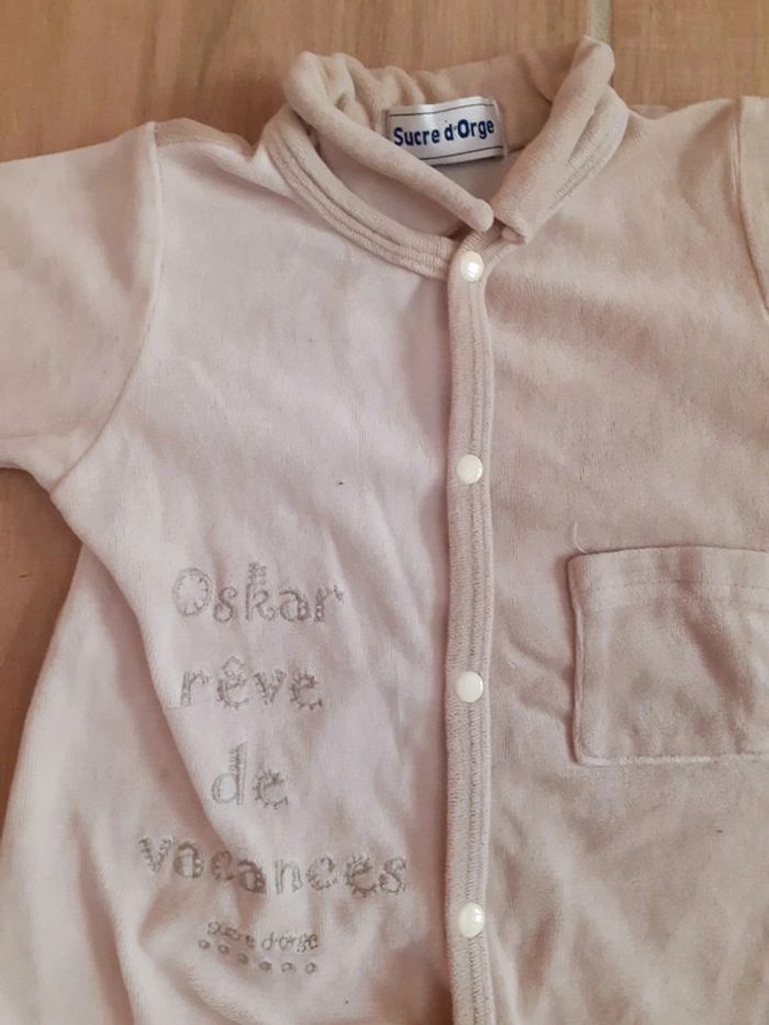 • Sucre d'orge : Gris/beige et blanc "Oskar rêve de vacances" - petite tâche sur le pied droit (photo)