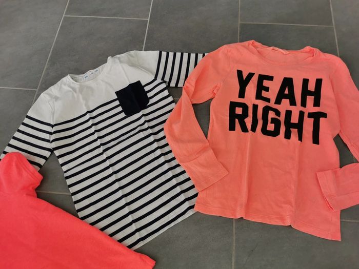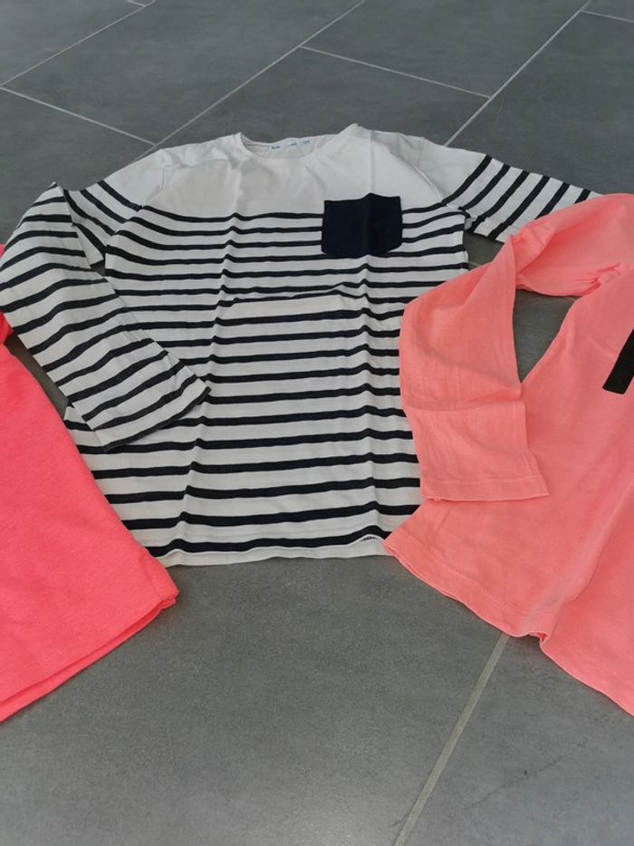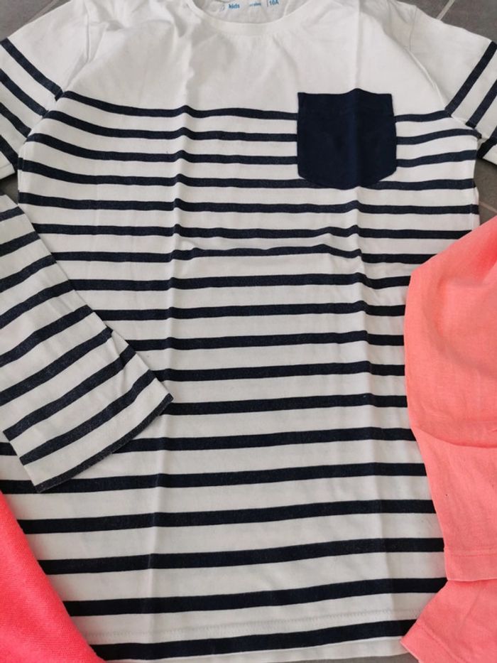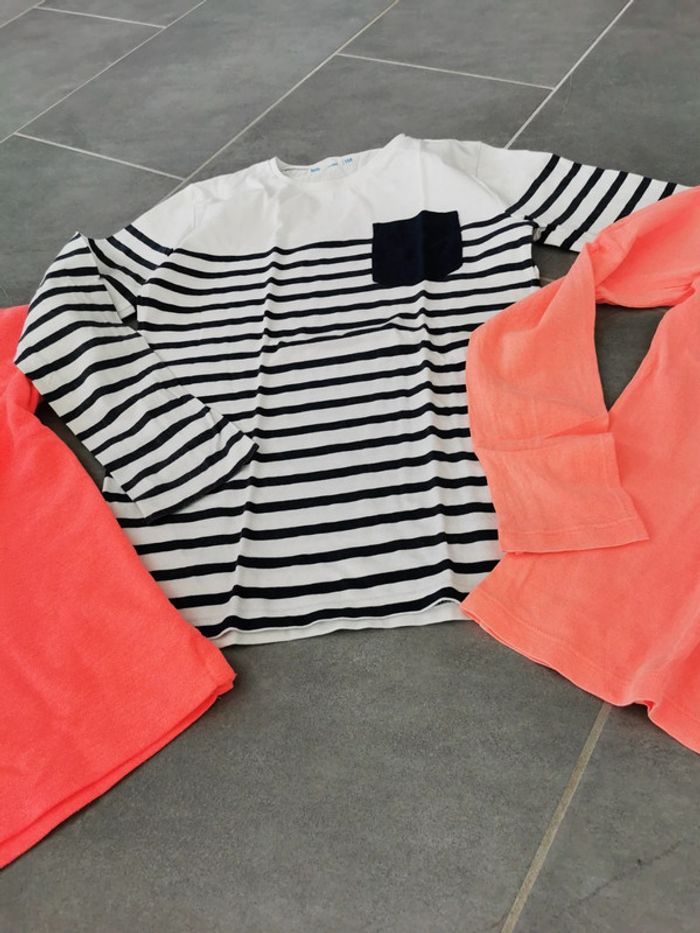 Lot 10ans 2 t-shirt manches longues. Gemo et h&m 1 polo. Fluo Manche courte. Primark Attention coup de crayon sur le polo voir photo Attention la marinière marine passé
