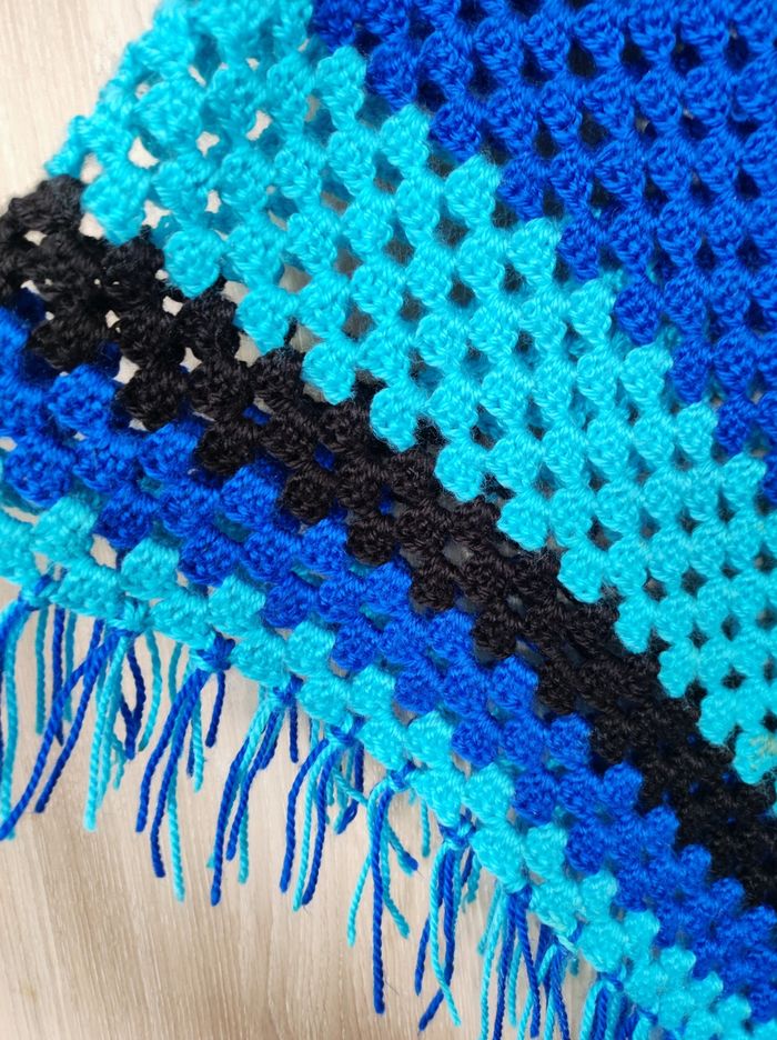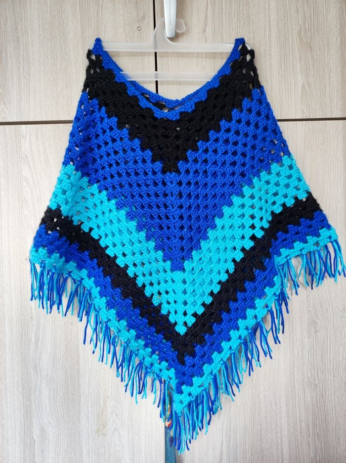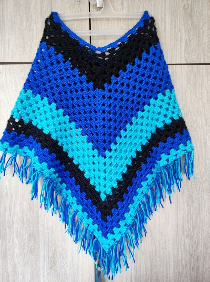 Poncho toute saison Modèle traditionnel Pour enfants - de 5 a 8 ans environ Coloris bleu turquoise , bleu foncé er noir. Coupe triangle sans manches. Franges au bout. Type tricot col v. Parfait etat. Comme neuf
