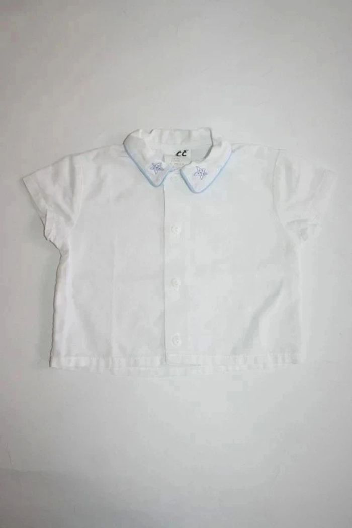 Chemisier blanc manches courtes avec liseret bleu au col + motif étoiles taille 3 Mois, 40g