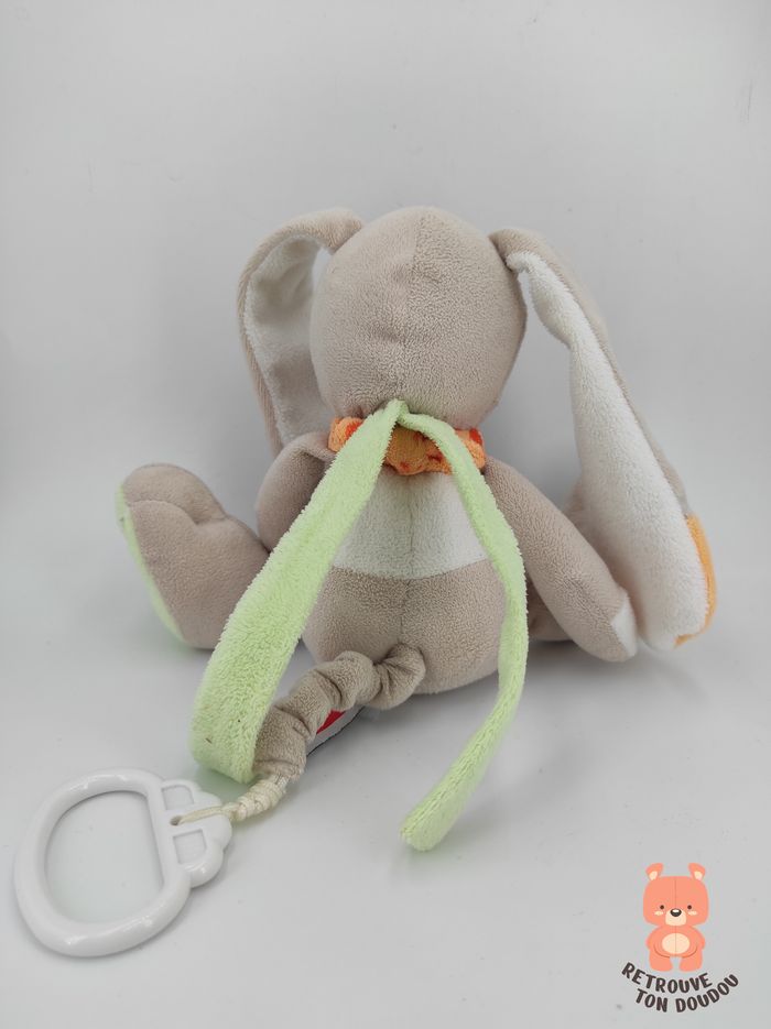 🐰 Doudou Musical Lapin gris taupe, bouts des oreilles orange, pieds verts, bandana orange, Influx ou Tex 📏 Dimension : 18 cm environ assis ✨ État : Occasion, bon état, la musique est un peu fatiguée quand la ficelle arrive sur la fin 🧼 Lavé avec lessive hypoallergénique 👀 Vous achetez le doudou que vous voyez sur les photos.