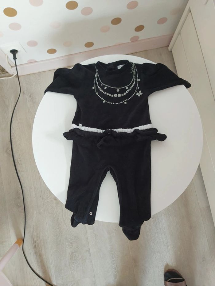Joli pyjama noir Avec motifs bijoux colliers argentés S'ouvre dans le haut du dos pour passer la tête Et s'ouvre entre les jambes pour changer la couche sans que bébé ne prenne froid ! #annesolo22_fille18mois