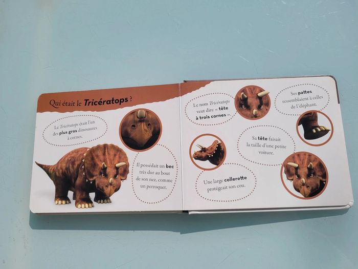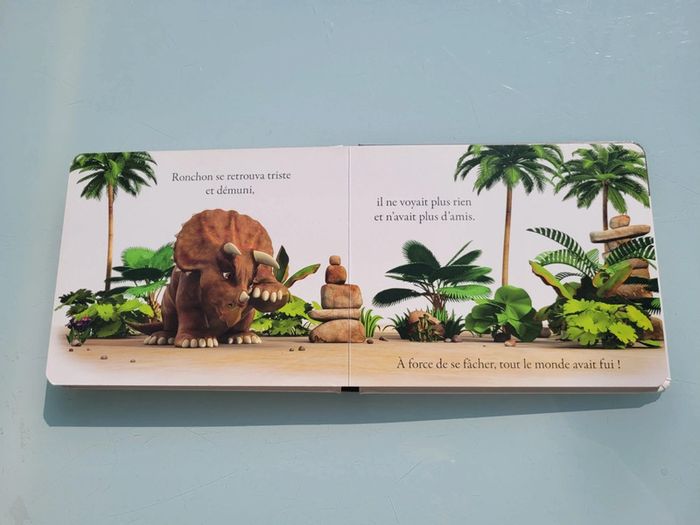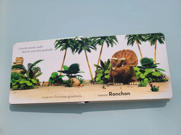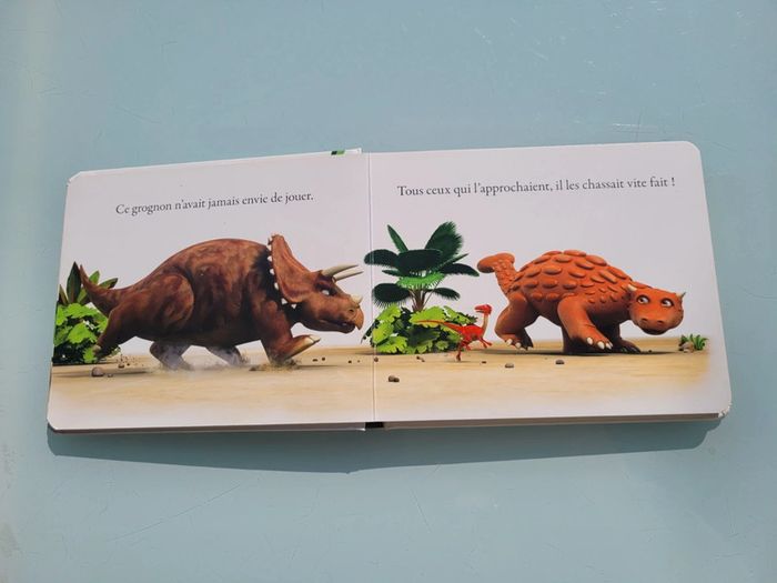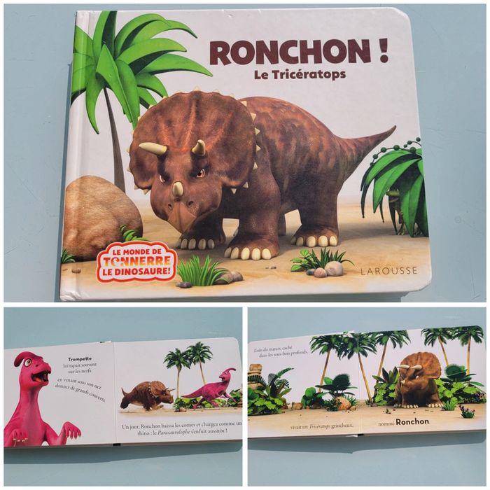 RONCHON! LE TRICERATOPS Les dinosaures fascinent les enfants dès leur plus jeune âge. Ils leur font peur, les intriguent, les impressionnent et suscitent de nombreuses questions… Avec Ronchon, le tricératops grognon, et sa bande de dinos, les tout-petits vont enfin pouvoir pénétrer ce monde qui les fascine ! Une histoire ludiqueUne double documentaire pour tout savoir sur le tricératopsDes illustrations en 3D qui respectent les caractéristiques propres et les proportions de chaque dinosauresDes personnages attachants au caractère bien trempé : Ronchon, le tricératops, est le solitaire de la bande. Résumé : Ronchon n’a jamais envie de jouer et chasse vite fait tous ceux qui viennent l’importuner. Mais grâce à une mésaventure, il comprendra que parfois dans la vie, on a besoin d’un ami. Dimensions ‎18.8 x 2 x 15.4 cm En très bon état, juste 2 petits poinçon sur le haut de la couverture (cf photo) Mes livres par thème : #livredinosauresmooglou Mes autres livres enfants : #livreenfantmooglou