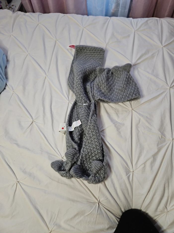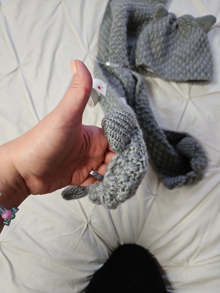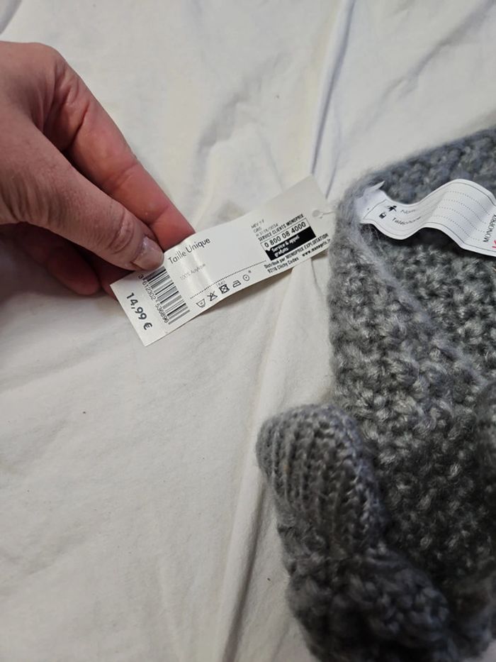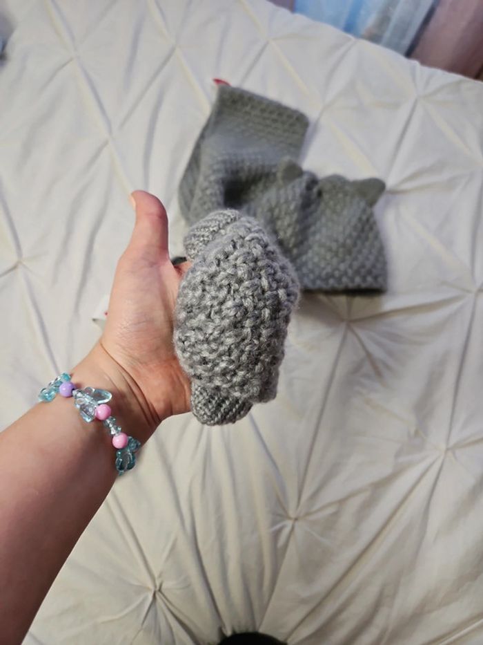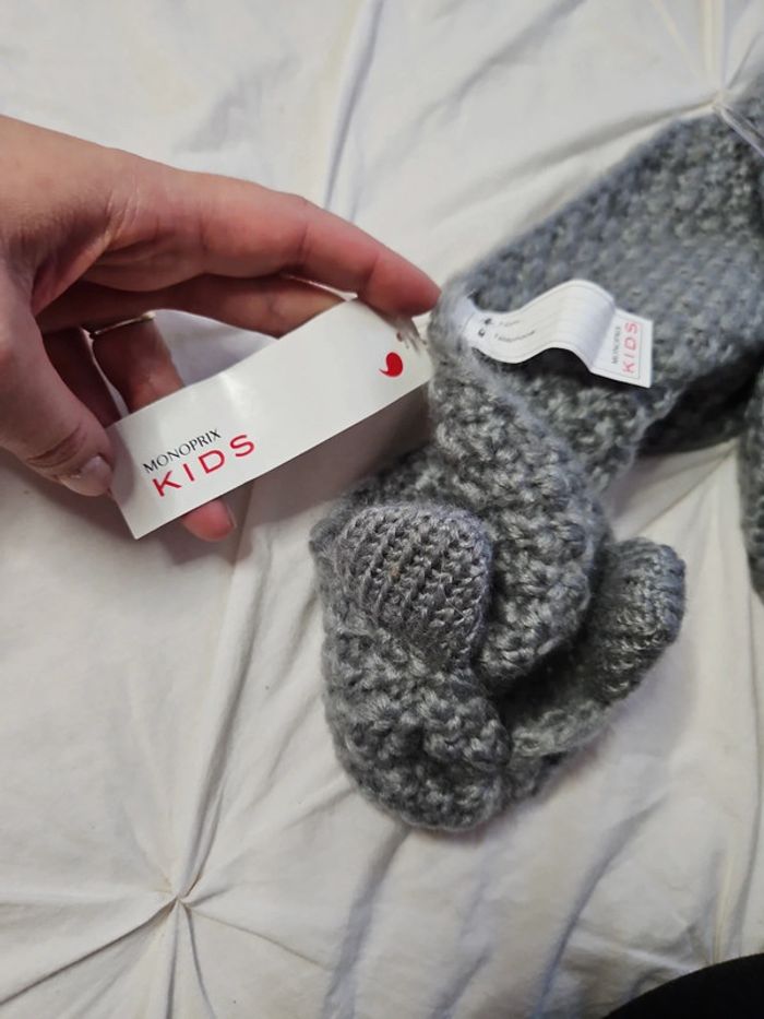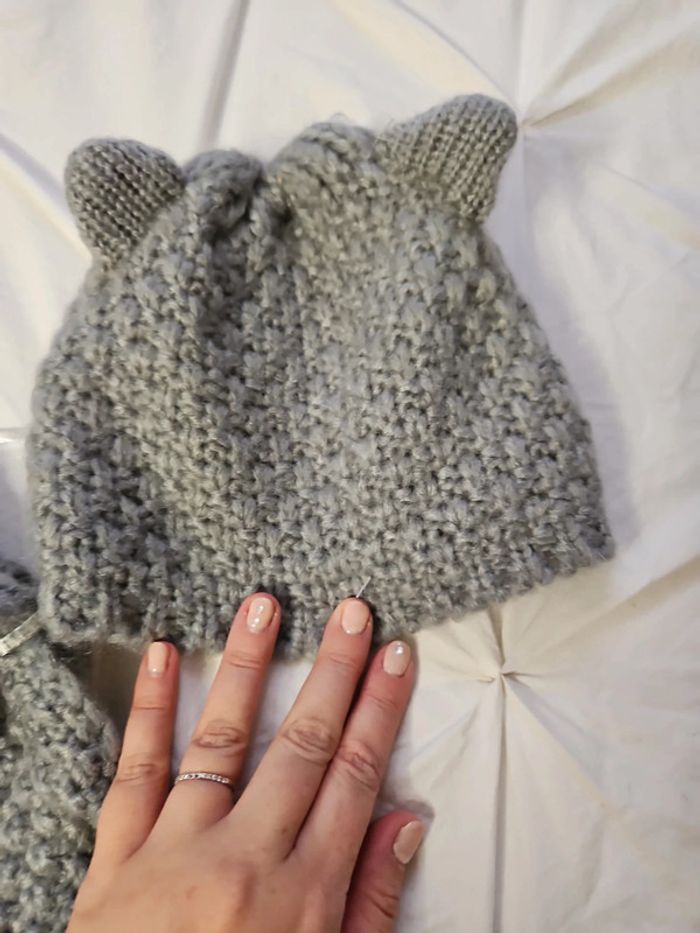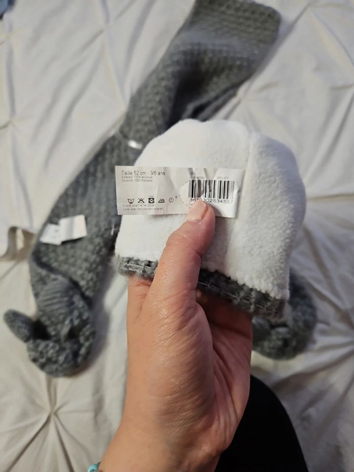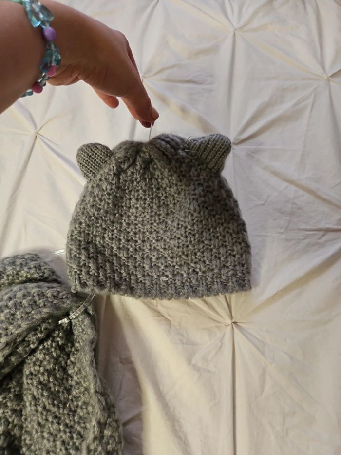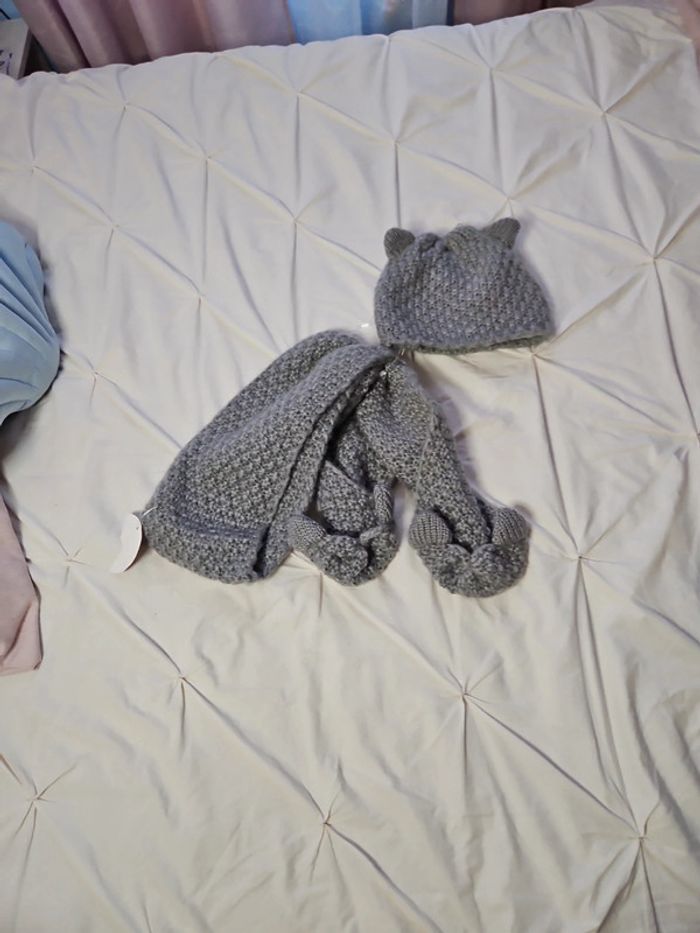bonnet en laine doublé avec oreilles de chat avec écharpe assortie, les extrémité sont reboulées pour que l'enfant puisse y cacher ses doigts pour se protéger du froid, au bout de celle-ci aussi il y a des oreilles de chat taille 3 à 5 ans