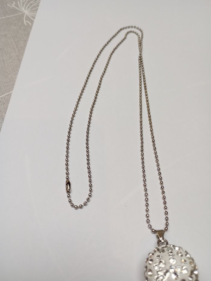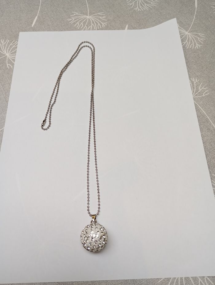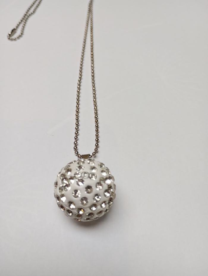 Collier avec boule blanche avec strass. Longueur : 40 cm Boule : 2,5 cm Très bon état.
