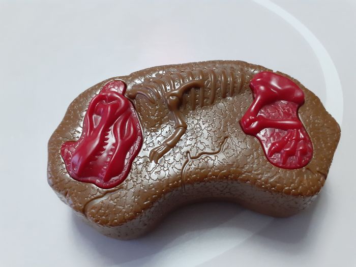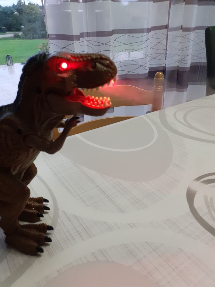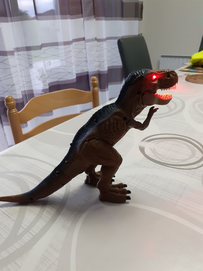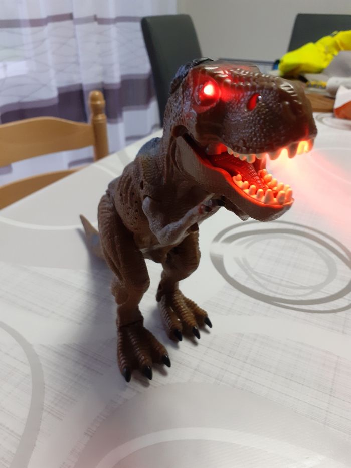 T-rex radiocommandé, effet lumineux et bruit et avance et recule et tourne la tête. Fait de la fumée. Très peu servi. Hauteur 23 cm