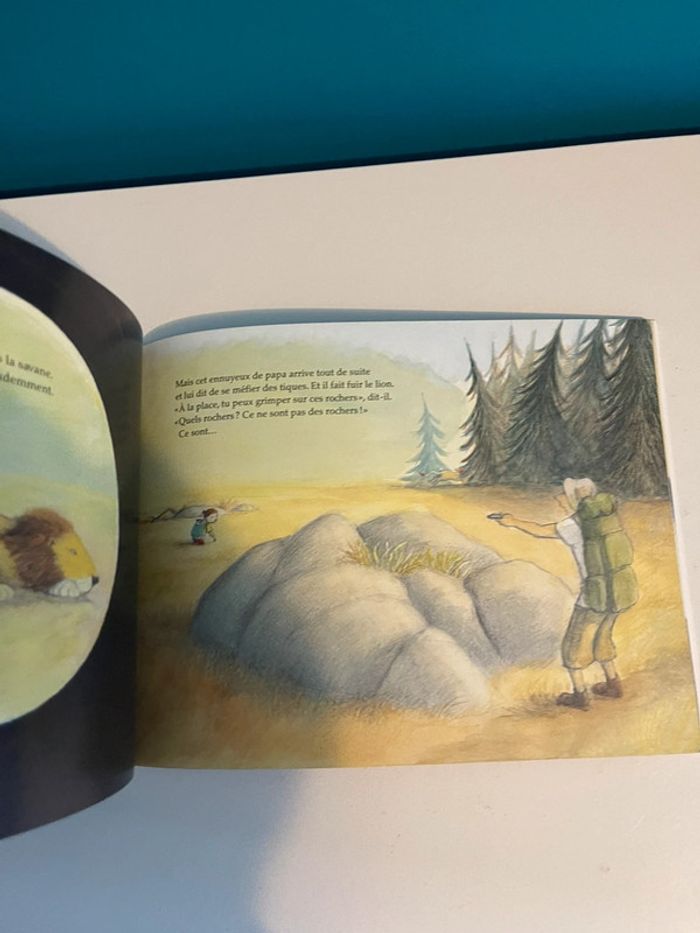 Très bon état Pendant les vacances, Tora et son papa iront camper au milieu des bêtes sauvages. Mais Papa est un peu ennuyeux. Il veut d’abord faire des courses, rouler longtemps en voiture… De plus, pour voir les bêtes sauvages, il faut regarder attentivement. Tora ne voit pas un seul animal. Papa regarde son GPS et ne voit rien non plus. Puis soudain, Tora voit l’anaconda, les 4 hippopotames, le lion, le troupeau de girafes… Mais son papa voit-il la même chose ?