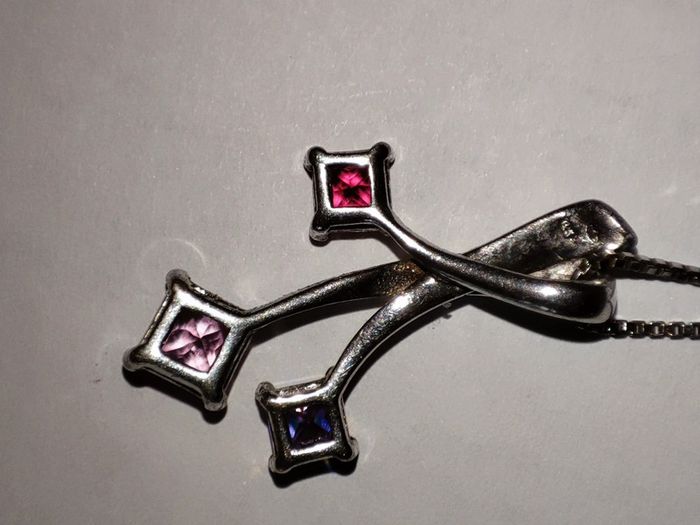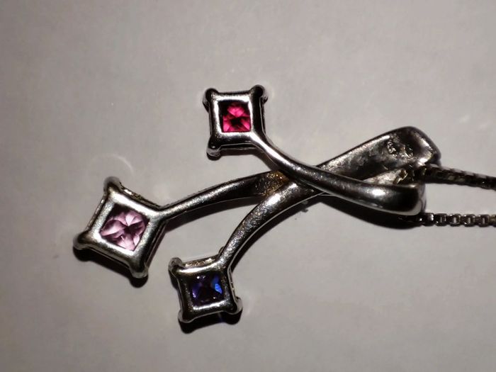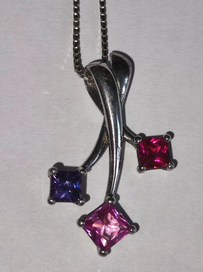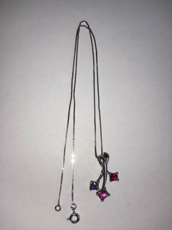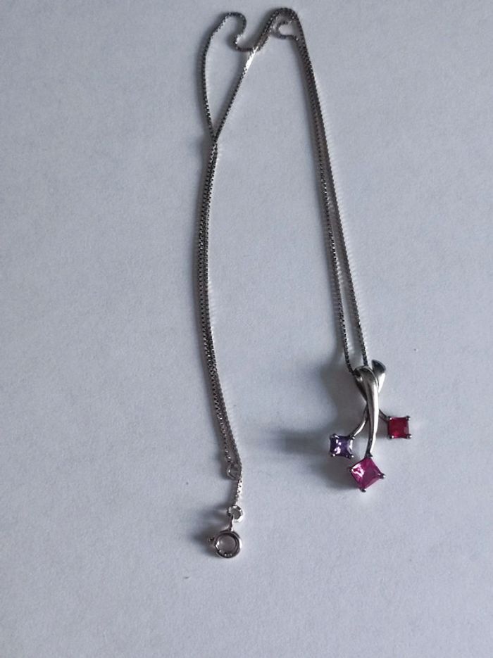 Très joli chaine et pendentif en argent, cristaux rouge, rose et violet 2 poinçons, 925 et de maître Pendentif 2,5 cm Chaîne 44 cm