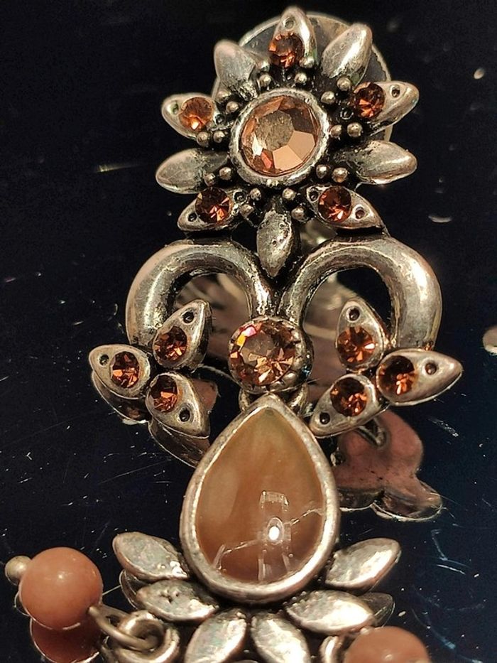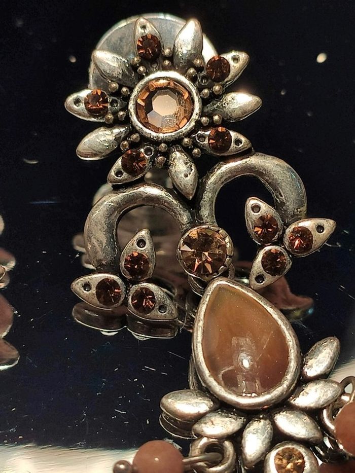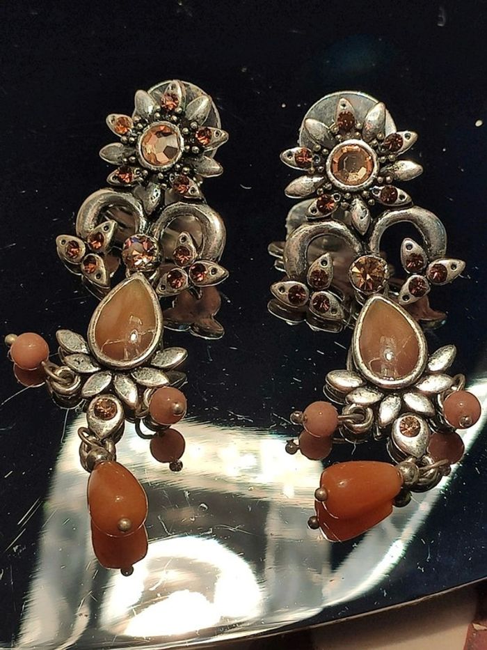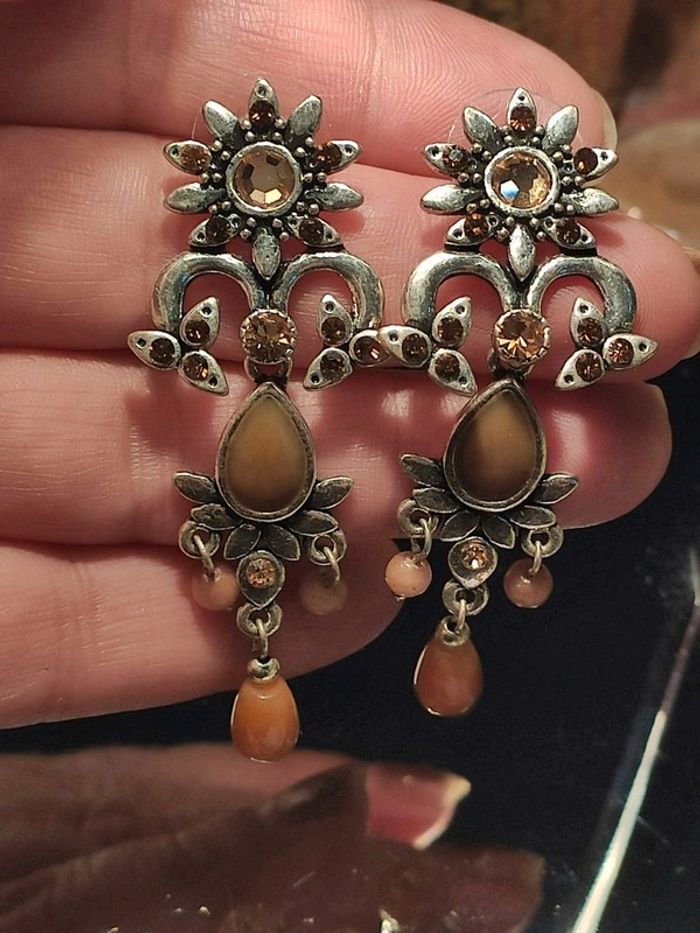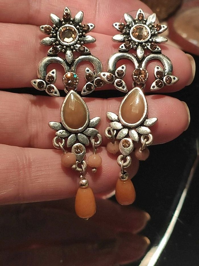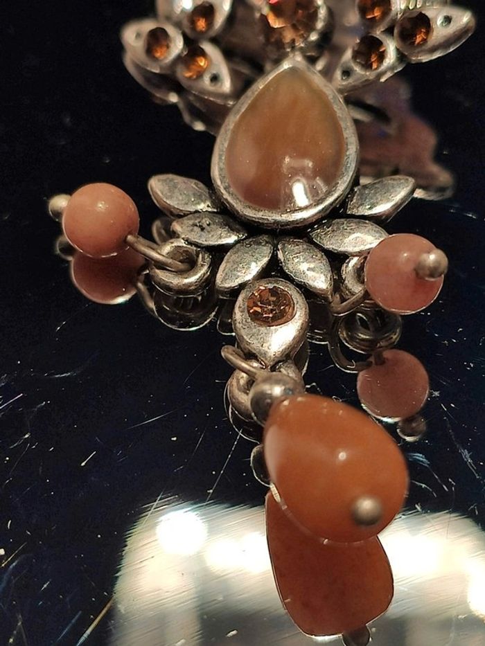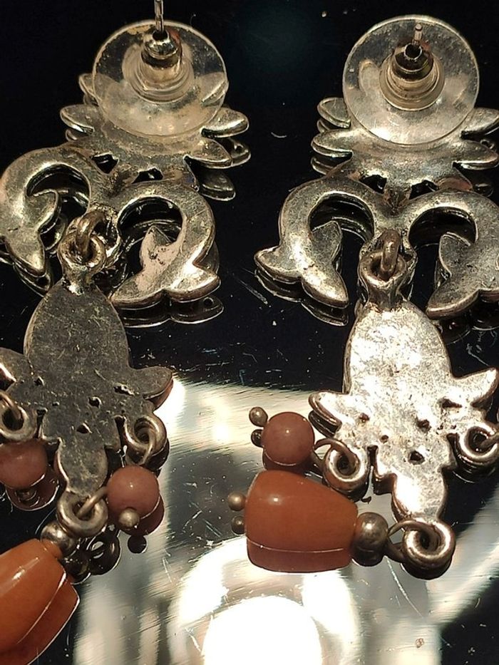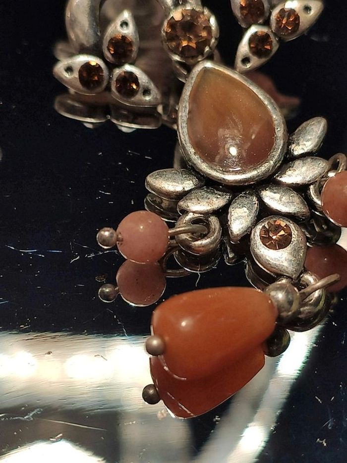 Jolie paire de boucles d'oreilles fantaisie argentée et ambre, 6 cm de long
