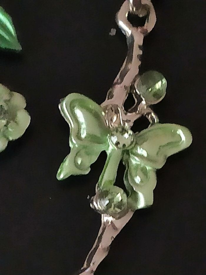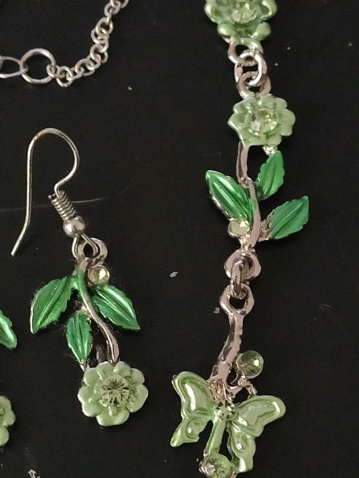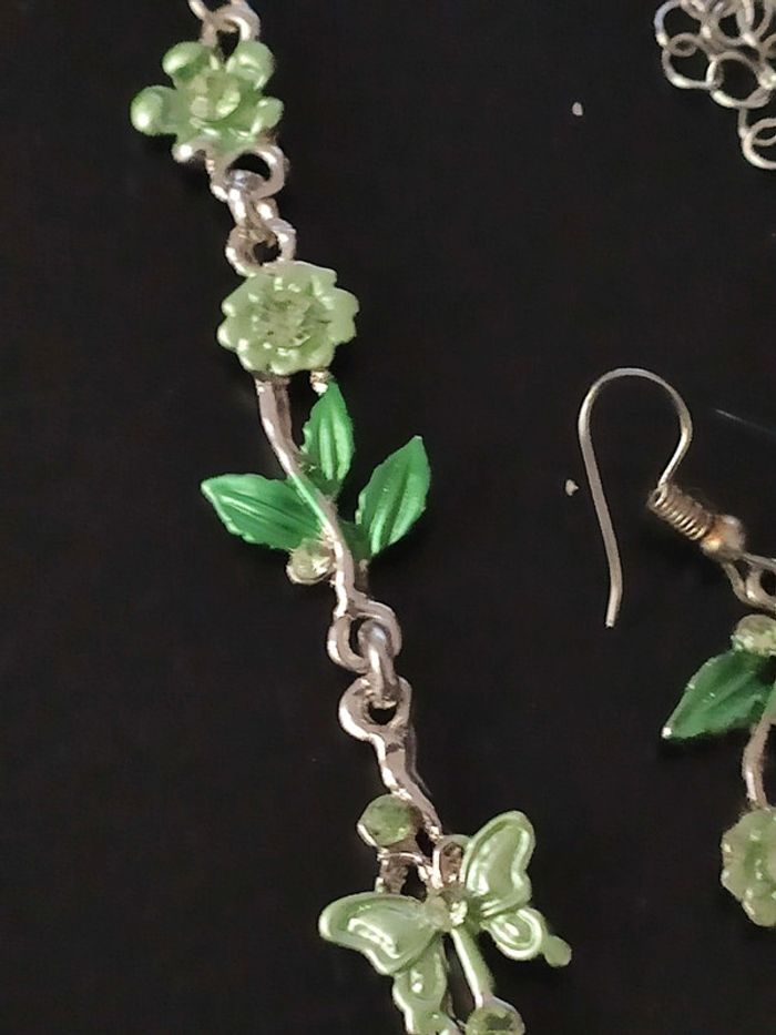Collier et boucles d'oreilles fantaisie fleurs et papillons, argenté et strass Orecchini, oorbellen, pendientes, earrings, Ketting, collar, collant, necklace