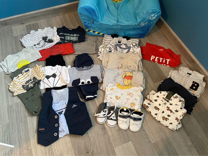 3 vestes (2 kiabi et l’autre obaibi) 1 maillot manches courtes kiabi 5 pyjamas (3 Disney, 1 lupilu, 1 bonjour bébé) 2 ensembles maillots manches longues pantalon (1 kiabi et l’autre sans marque) 1 ensemble avec pull pantalon sans marque 5 maillots sans manches (1 Disney, 2 tex, 2 kiabi) Ensemble boléro (gemo) et chemise (kiabi) 2 paires de chaussures 1 kiabi et l’autre Lulu castagnette #cindyenzo026mois