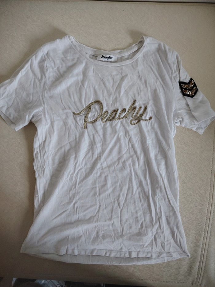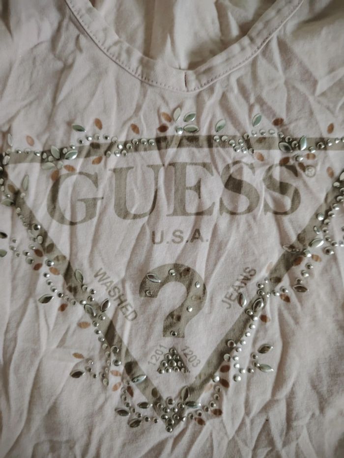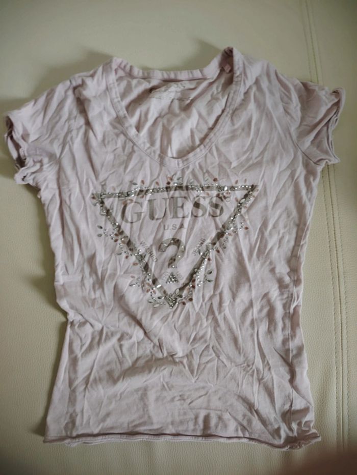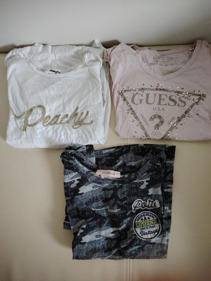 Vend lot de t-shirt femme en bon état général taille s ou xs. Certaines strasses sont décollées sur le t-shirt guess. Une tâche est présente sur le t-shirt militaire et une lettre se decole Des étiquettes peuvent être coupees, certaines étiquettes peuvent être notées 38 ou m mais taille plus petits Plus de photos sur demande si besoin