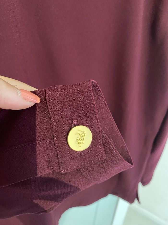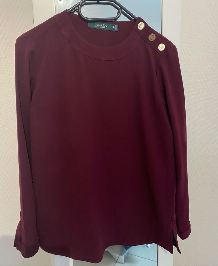 ✨ Superbe blouse chemise Ralph Lauren pour femme. Marque de prestige, chic et intemporelle. 👔 Marque : Ralph Lauren 📏Taille XS (convient aussi à un S) 🎨Couleur : Bordeaux 💎Boutons dorés siglés Ralph Lauren ✅1 bouton de secours inclus 🧼État : Portée une seule fois, en excellent état.