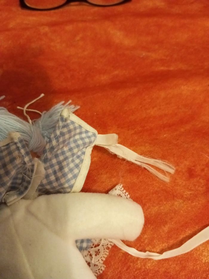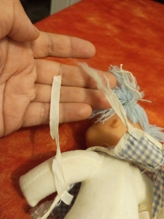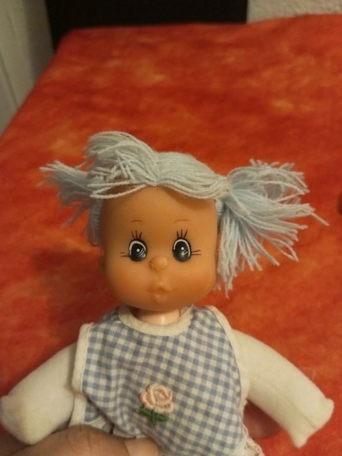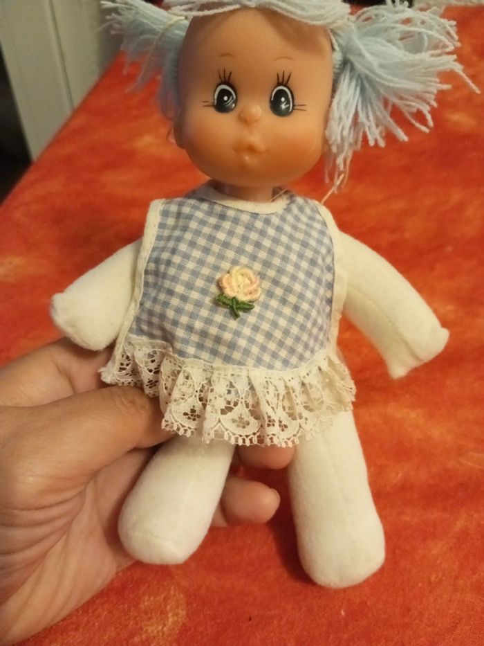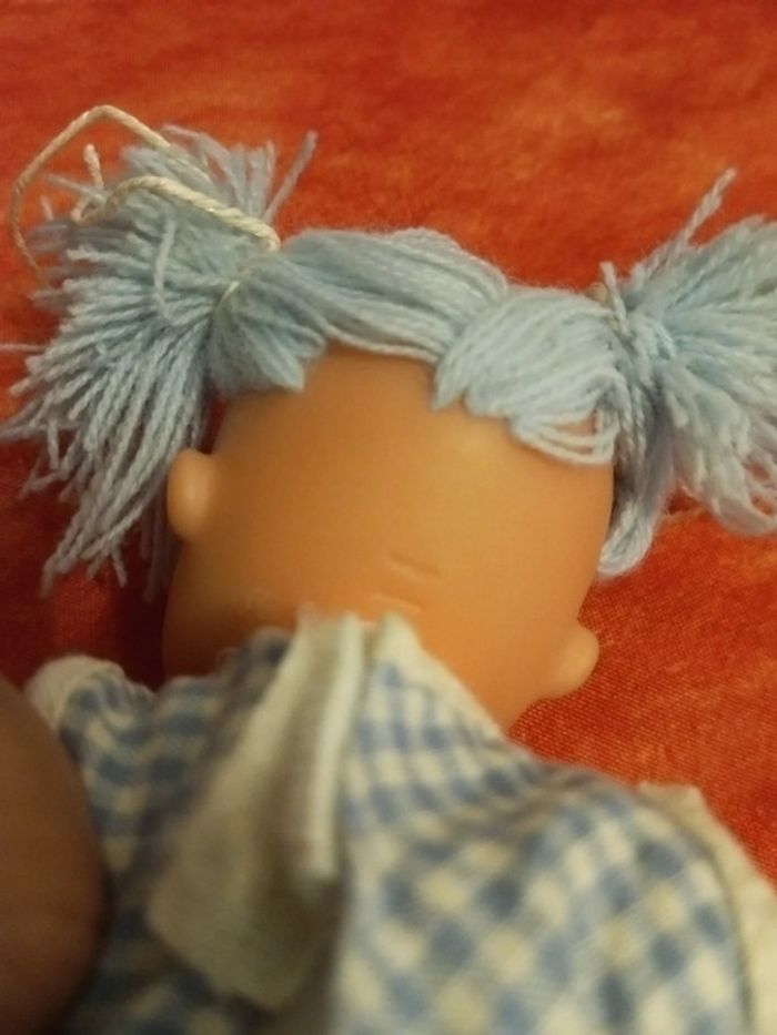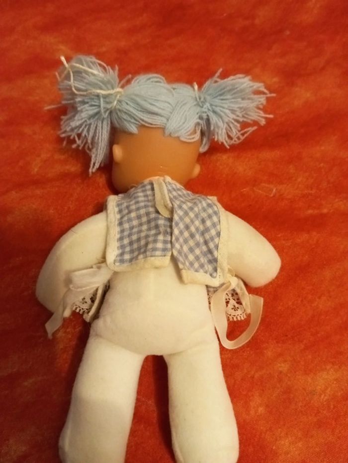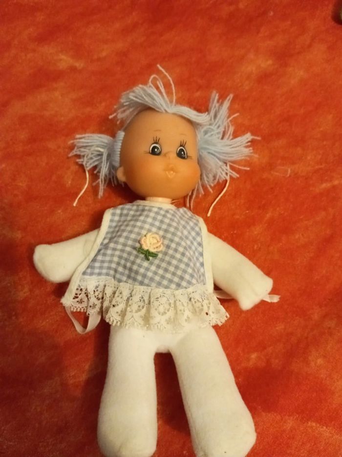 Poupée avec des cheveux en laine bleu et une tunique bleu vichy avec une fleur au centre et dentelle, vintage En très bon état, mis à part les liens pour attacher la tunique, vendu comme sur les différentes photos. Dans mon dressing, il y a d'autres peluches , des doudous, des Petshop, des Lego Duplo, des Playmobil, des Barbie et beaucoup de jeux et jouets vintage