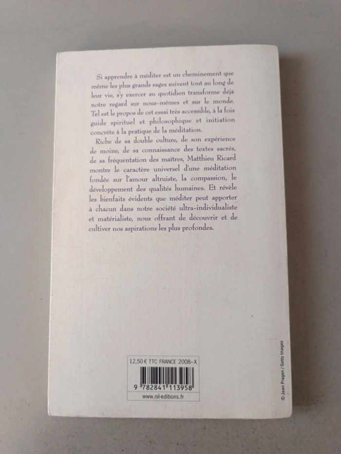 Matthieu Ricard l'art de la méditation. Prix neuf 12,50 €. La tranche du livre est un peu abîmée. Voici le lien pour voir tous mes livres : #romain75015_Livres et #romain75015_Santé. Envoi rapide et soigné bien protégé pour le transport. N'hésitez pas à faire un lot pour avoir des réductions et mutualiser les frais de port.