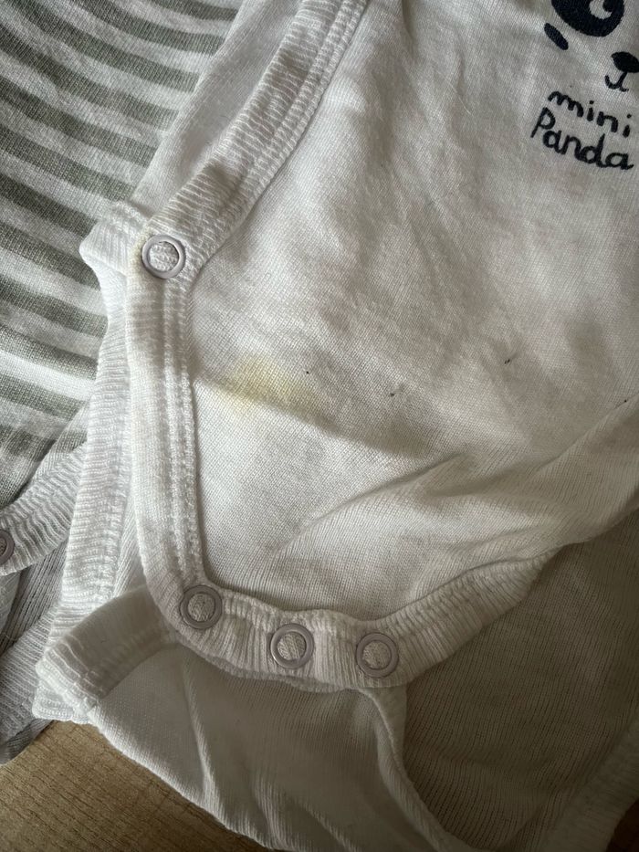 Lot de 3 bodies Manche courte et ouverture avec pression ventral Le body mini panda présente un tache au niveau d’une pression