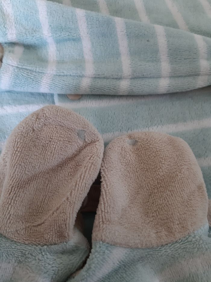Porté quelques fois, en bon état. Un peu abîmé mais troué au niveau des pieds ( voir dernière photo ) mais pas de tâches. Taille correctement. Âge : 6 mois.