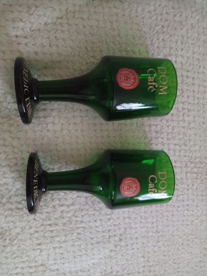 2 Verres à Pied "DOM Café Bénédictine" Dimensions: Hauteur 14cm - Diamètre 5,5cm Couleur: Vert transparent avec inscriptions Rouges et Écrues Verres en très bon état, vendus comme sur les photos (Quelques lettres de Bénédictine s'effacent un peu)