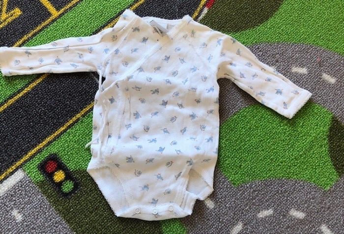 Body à manches longues en excellent état. S’attache sur l’avant. Motifs hirondelle. Taille 1 mois.