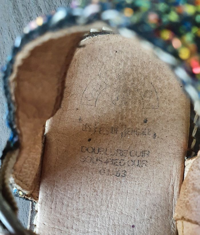Sandalettes pailletés Taille 32 Doublure et sous pied cuir Manque quelques paillettes, sangle un peu abîmé, semelle intérieure pas nickel, semelle extérieure dessous peu usée mais à l'arrière, un peu râpée. (Voir les différentes photos)