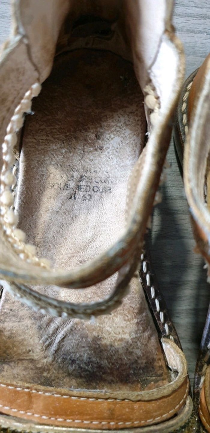 Sandalettes en cuir avec fermeture taille 29 Traces d'usures normales (voir photos) Manque une rangée de "pompons" (voir 3ème photo) Semelle épaisse