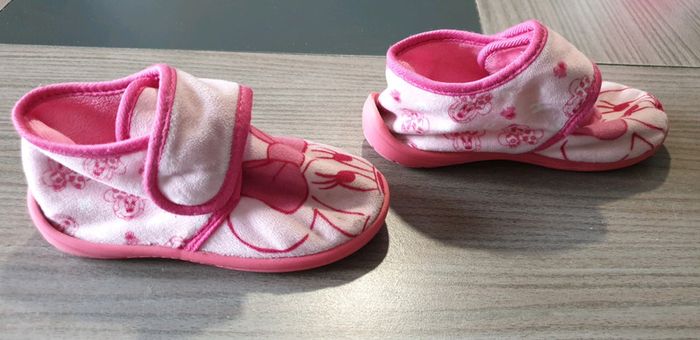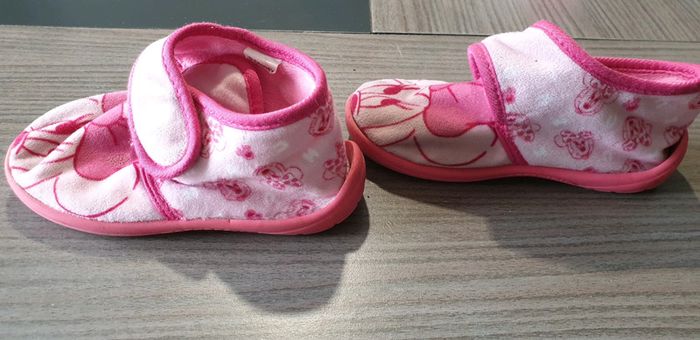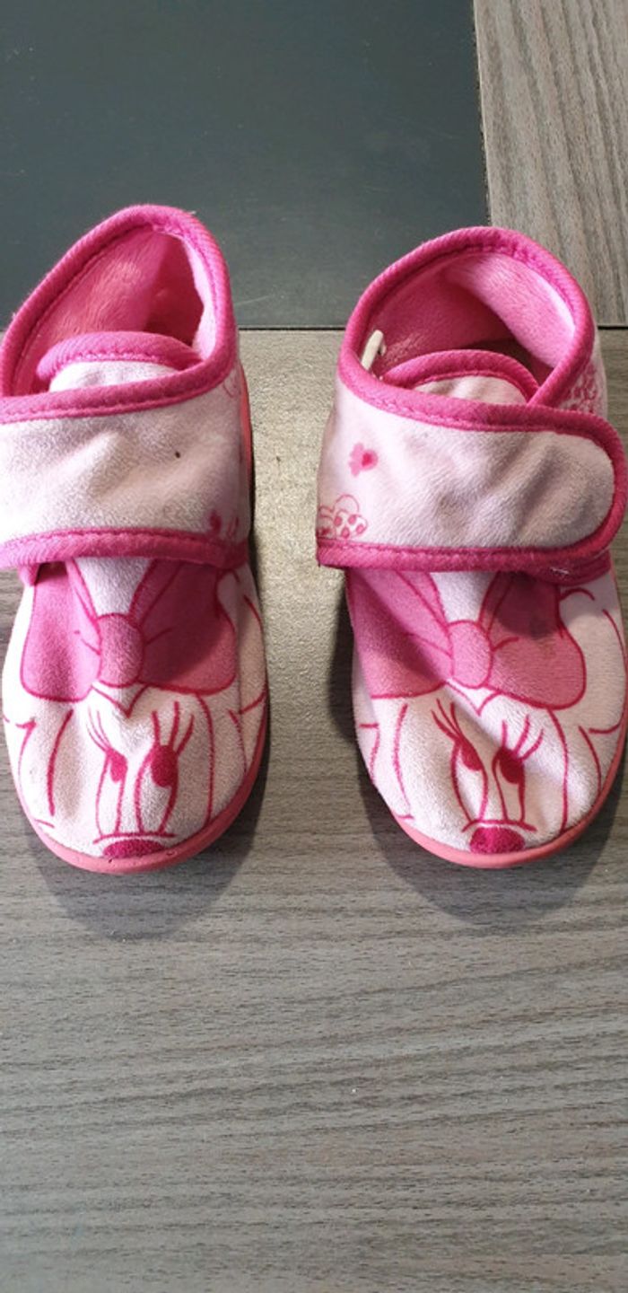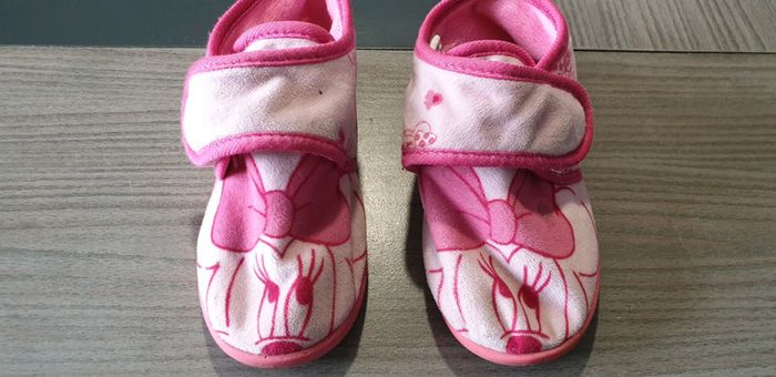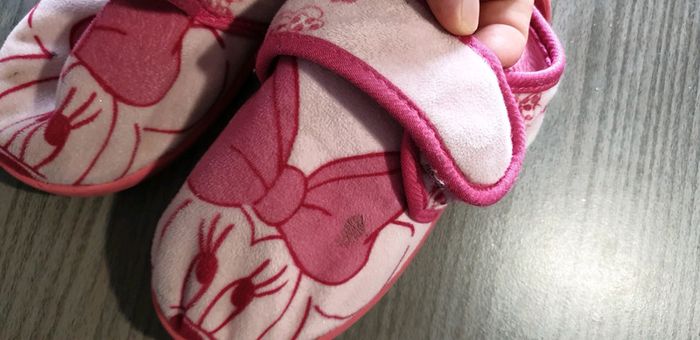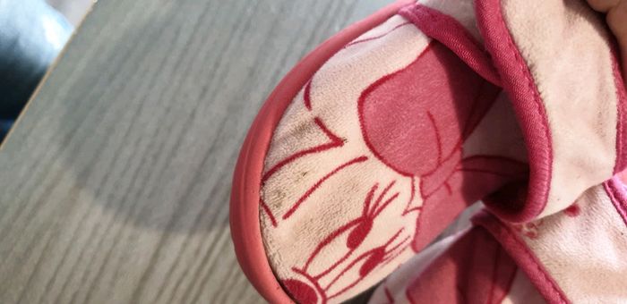 Chaussons minnie taille 27 Disney Ils n'ont pas été lavés donc je pense que les taches partiront en machine. L'arrière des chaussons est décollé mais ne gêne en rien.