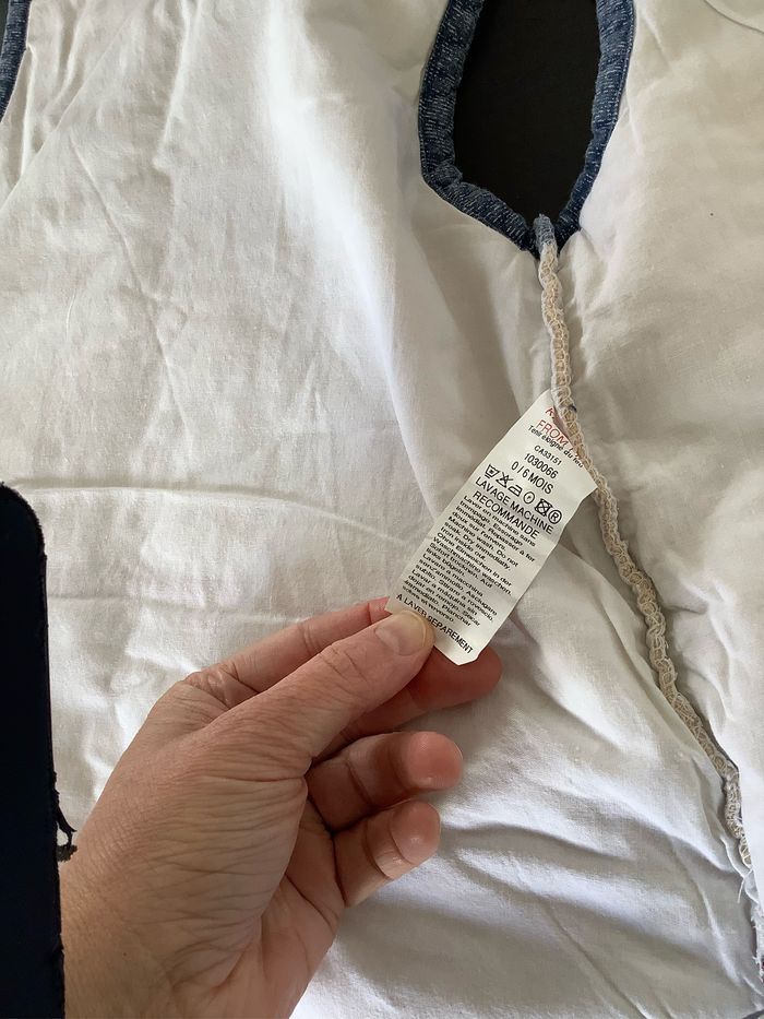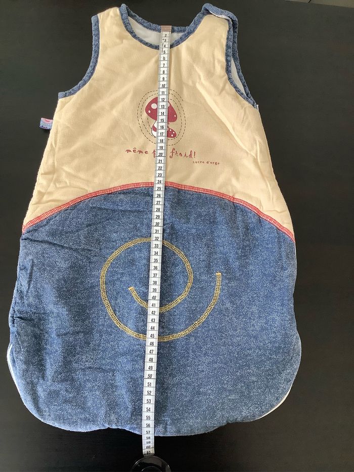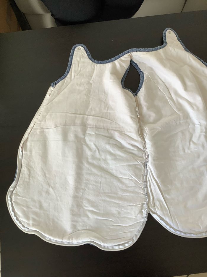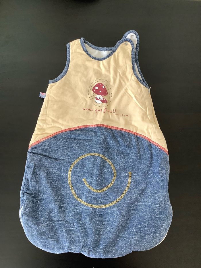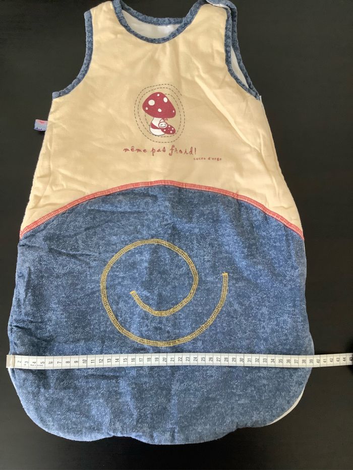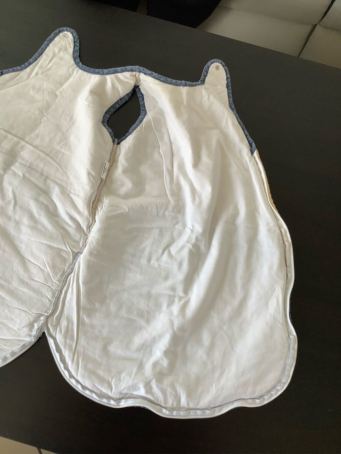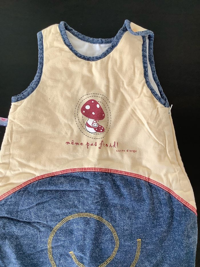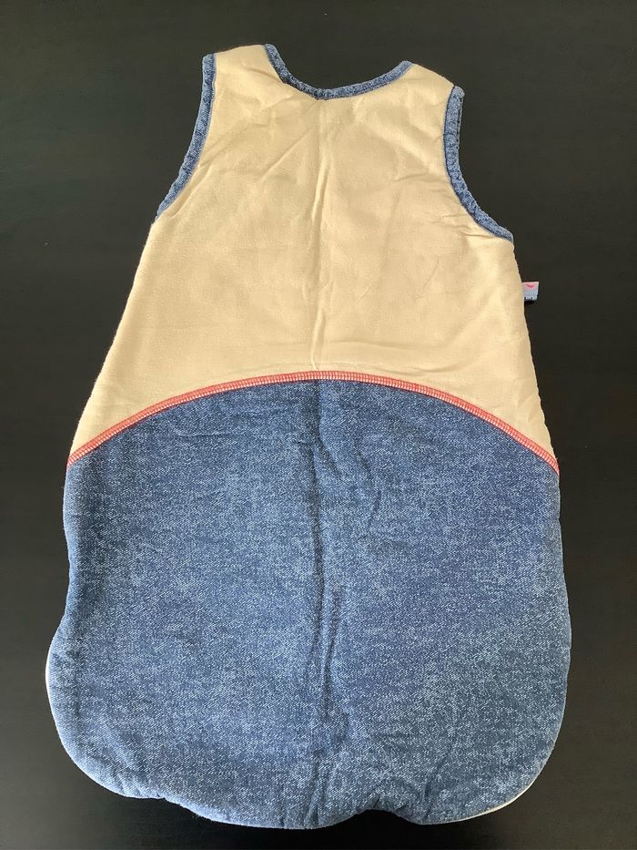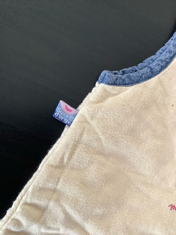 Turbulette Gigoteuse 0/6 mois coloris beige et jeans Fermeture éclaire et pression. Marque : Sucre d’orge Utilisée plusieurs fois, juste quelques bouloches (voir photos) At51250