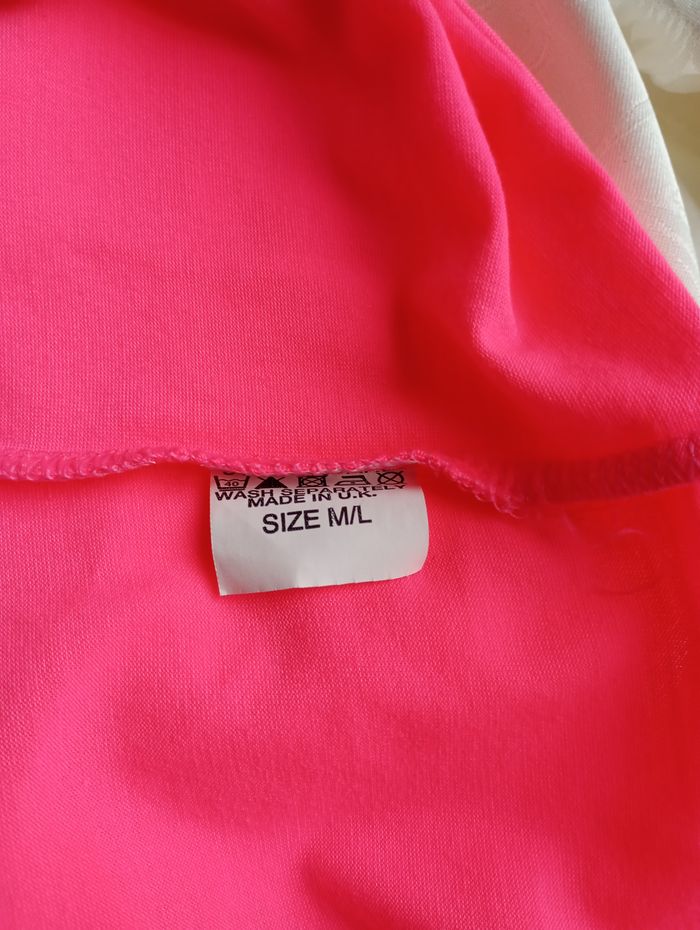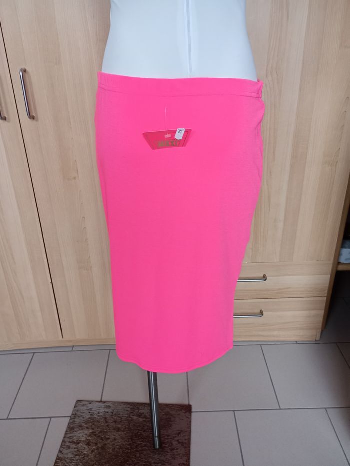 Jupe rose fluo en matière t-shirt. Très élastique. Taille : M/L Marque : Guxxi. Longueur : 61 cm Largeur (non étirée) : 37 cm