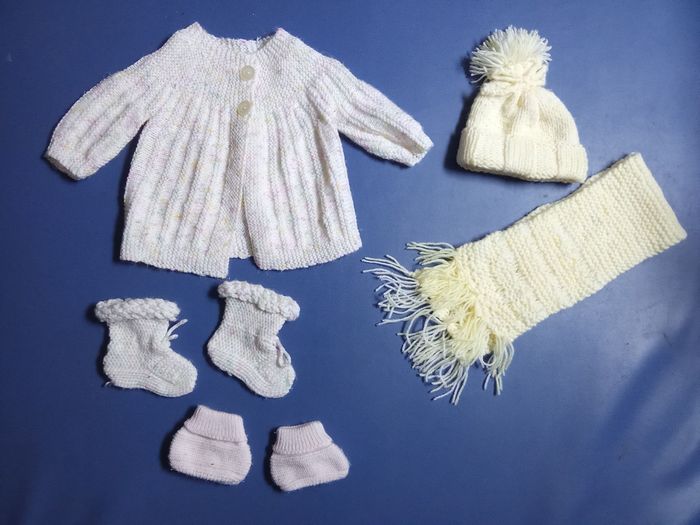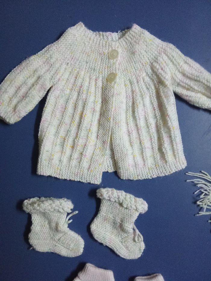 Lot 0-6 mois, ensemble tricoté fait main, maison,  pour bébé fille gilet, bonnet, écharpe, chaussons - photo numéro 1