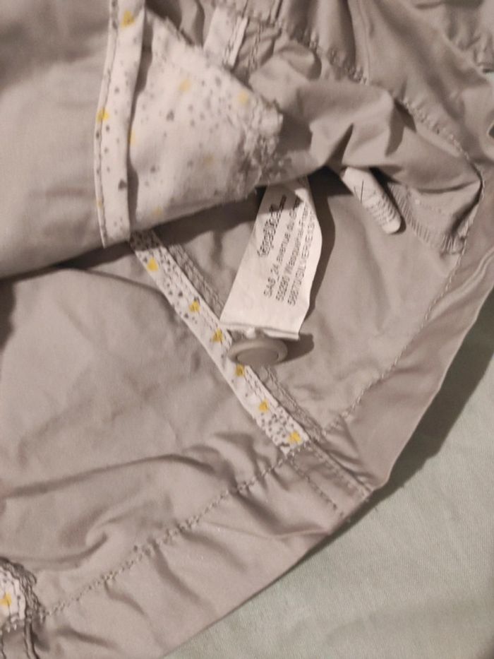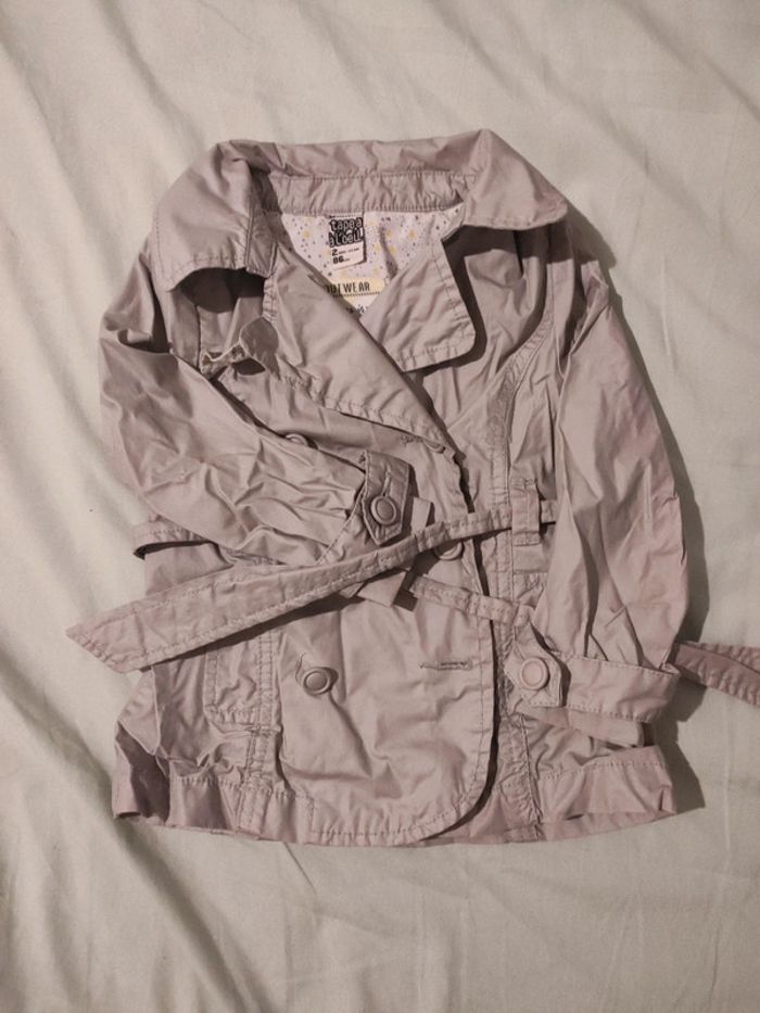 #tingvie2a Imperméable taille 2 ans tape à l'oeil avec ceinture. Il manque le bouton du bas qui peut être remplacé avec celui d'avance. Il n'y a plus non plus le bouton intérieur qui peut être remplacé par n'importe quel bouton.