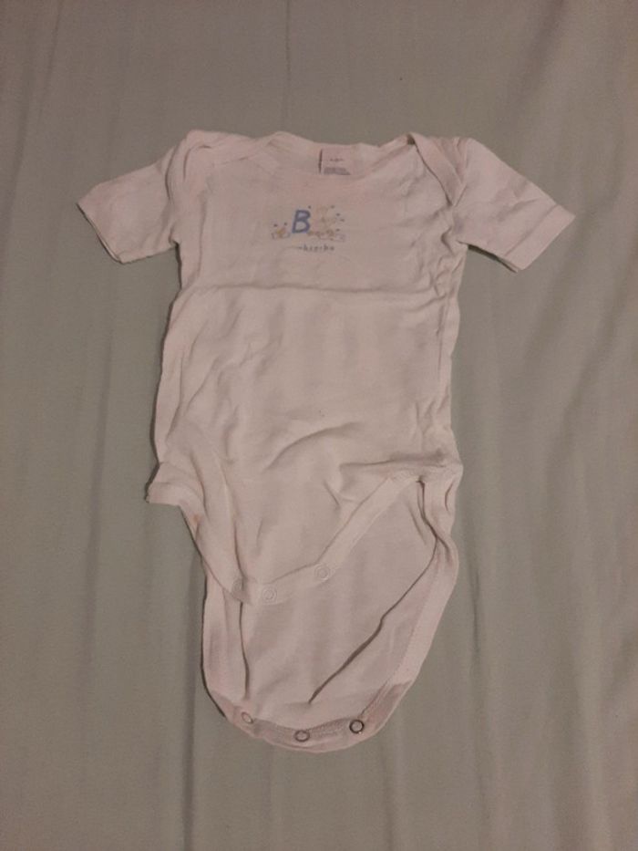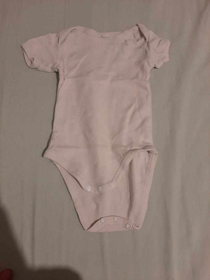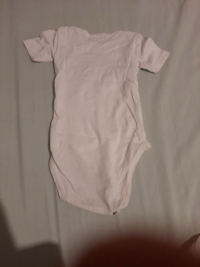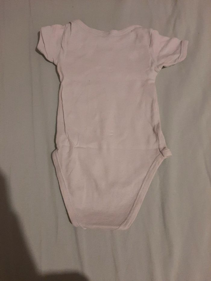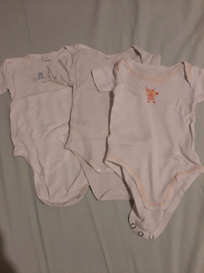 #tingvie6m Lot de 3 bodies manches courtes taille 6 mois. Il y a un qui a une tâche.