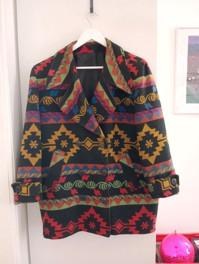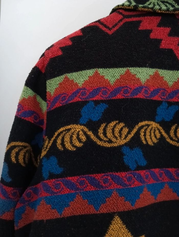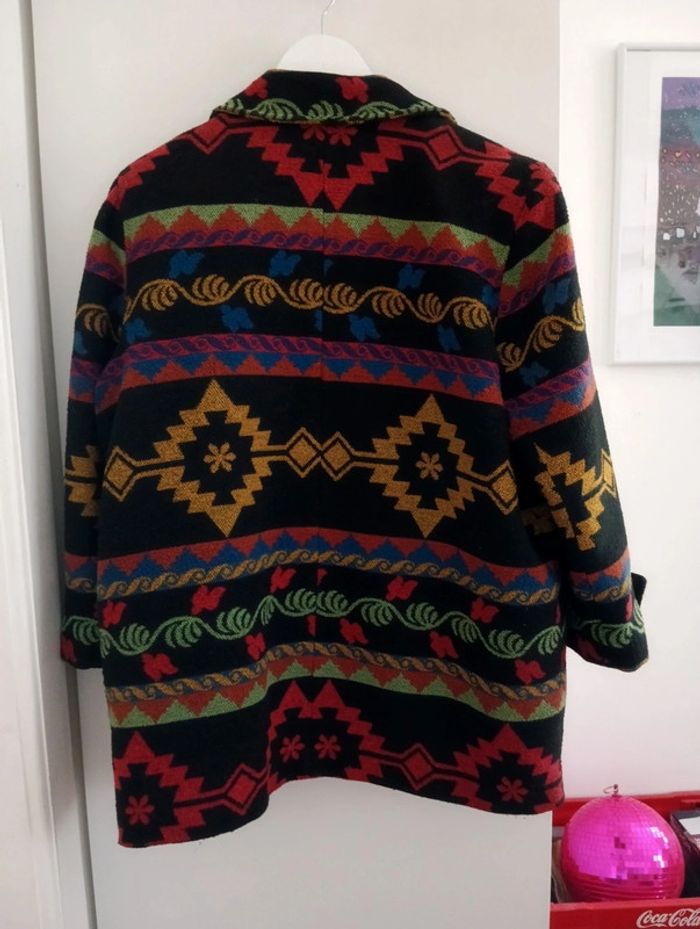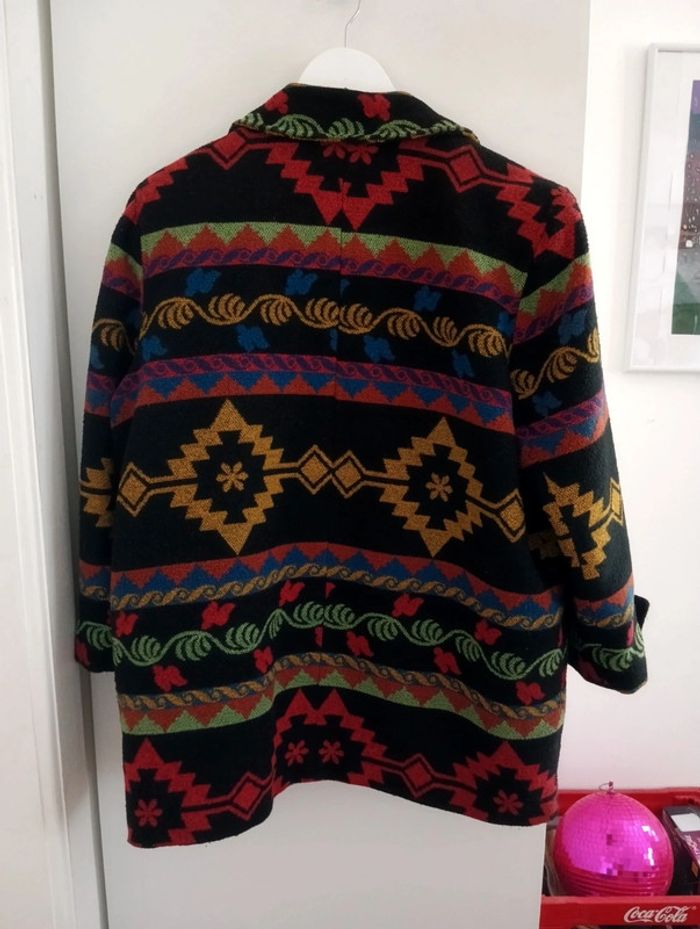 Veste caban graphique noire et multicolore Mesures Epaules 47cm Aisselles 61cm Longueur 78cm Il n'y a plus d'étiquette de composition ni de marque