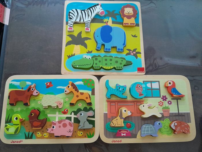 lot de 3 puzzles en bois (dont deux de marque Janod).