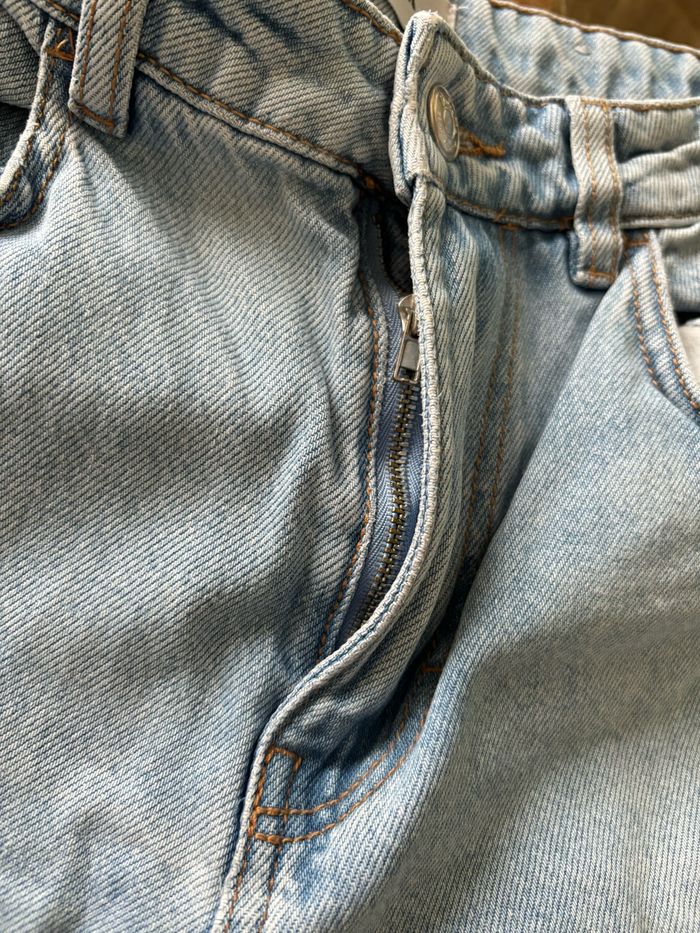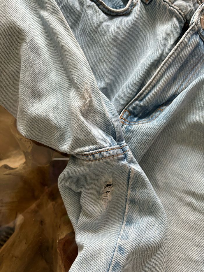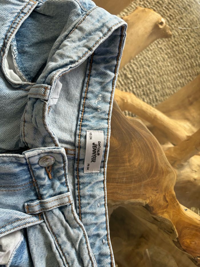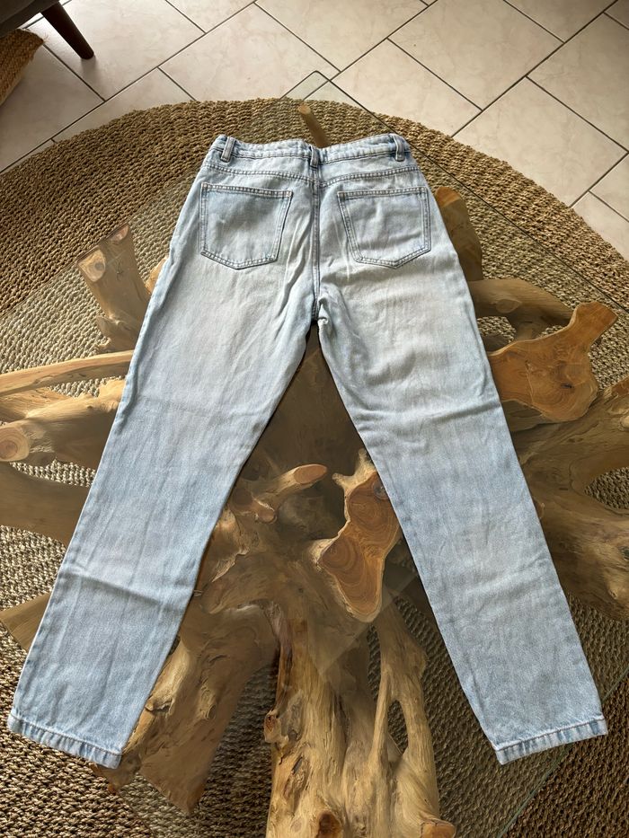 Jean Don't call me Jennyfer Mom Bleu clair Taille 34 Bon état : abîmé au niveau de l'entrejambe (voir dernière photo). Mérite une seconde vie.