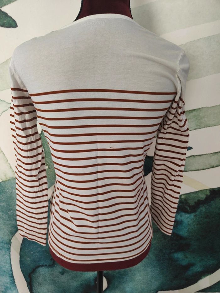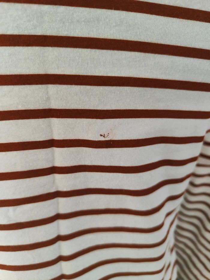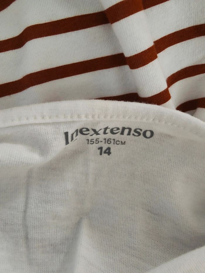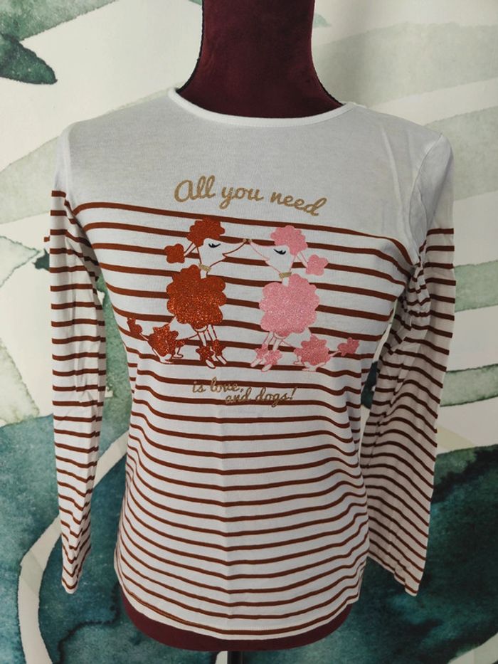 T shirt manches longues In extenso. Motifs caniched. Blanc rayé marron 14 ans Très bon état : à noter la présence d'une tâche à l'arrière du t shirt (voir dernière photo) N'hésitez pas à faire des lots ✨ réduction dès 2 articles Pour voir mes autres articles pour fille en 14 ans: #fille14ansludi2607 Pas de remise en main propre