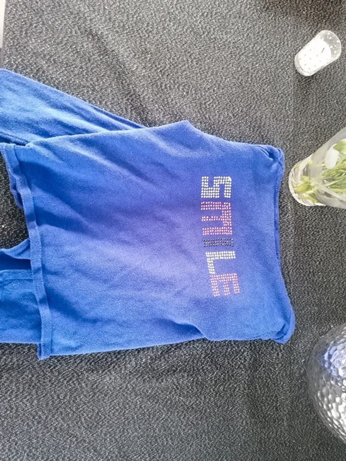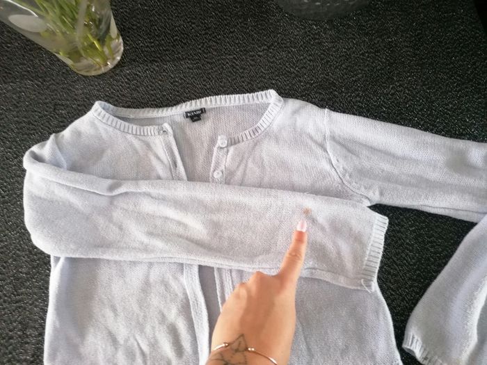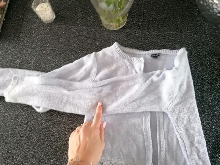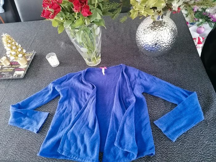 #Article_à_1euro #10ans_krocaro 1gilet bleu gemo taille 10ans Écriture dos strass Donne 1gilet bleu ciel Kiabi 10ans style boléro attention Cf photos tâches