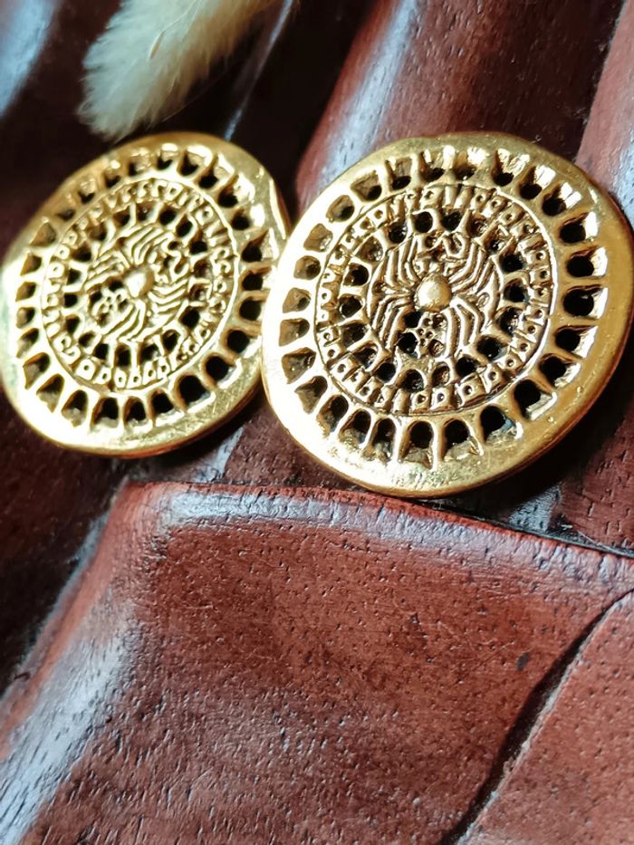 Boucles d'oreilles rondes à clipser Vintage Original et atypique, un motif qui nous rappelle le Pérou ou africain... Avec au centre une araignée, symbole de patience et de persistance 🌹 3cm de diamètre #calmbijoux #bouclesdoreillesboho #bouclesdoreillesvintage #calmbijoux #bouclesdoreillesvintage
