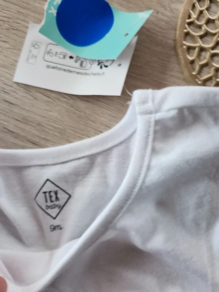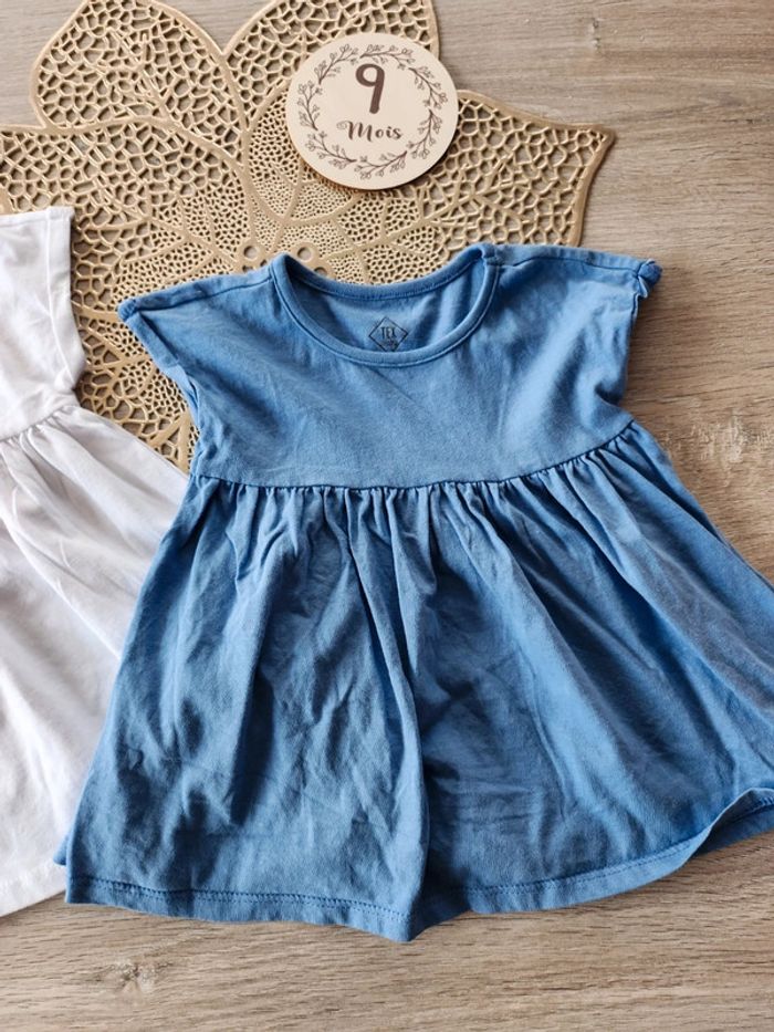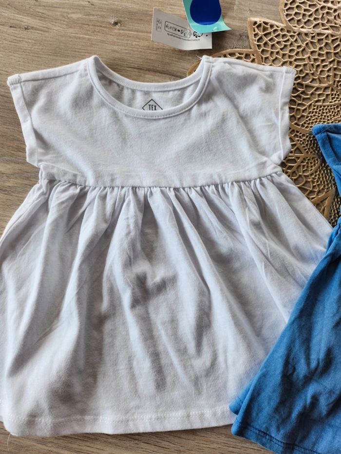 Joli lot de 2 robes manches courtes 1 bleue et 1 blanche En tres bon état la blanche n'a pas été portée donc neuve étiquetée. 9 mois Tex 3€ #robetex9mois #robe9moisfille