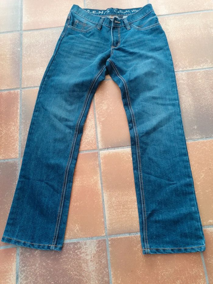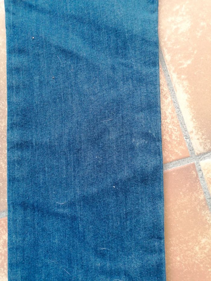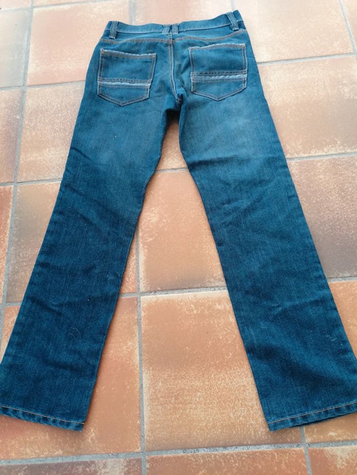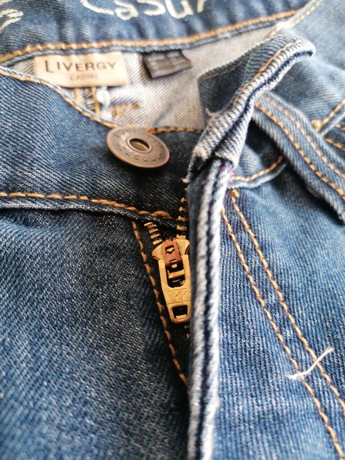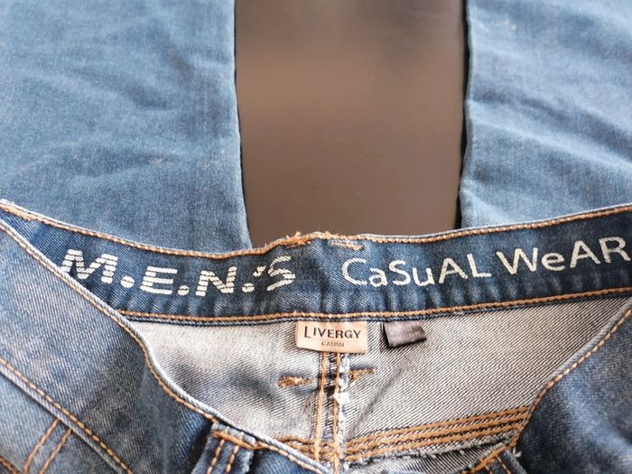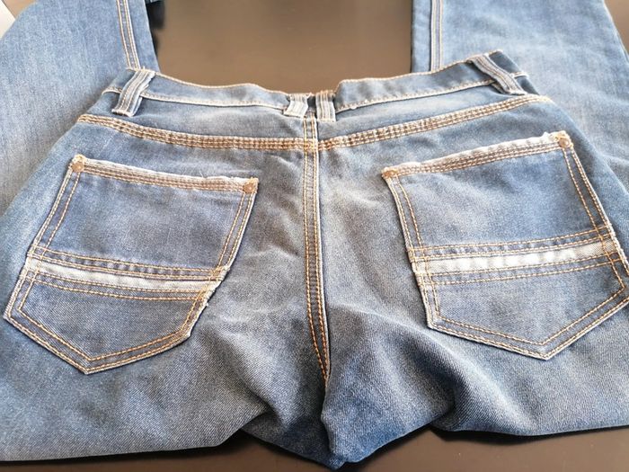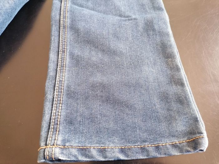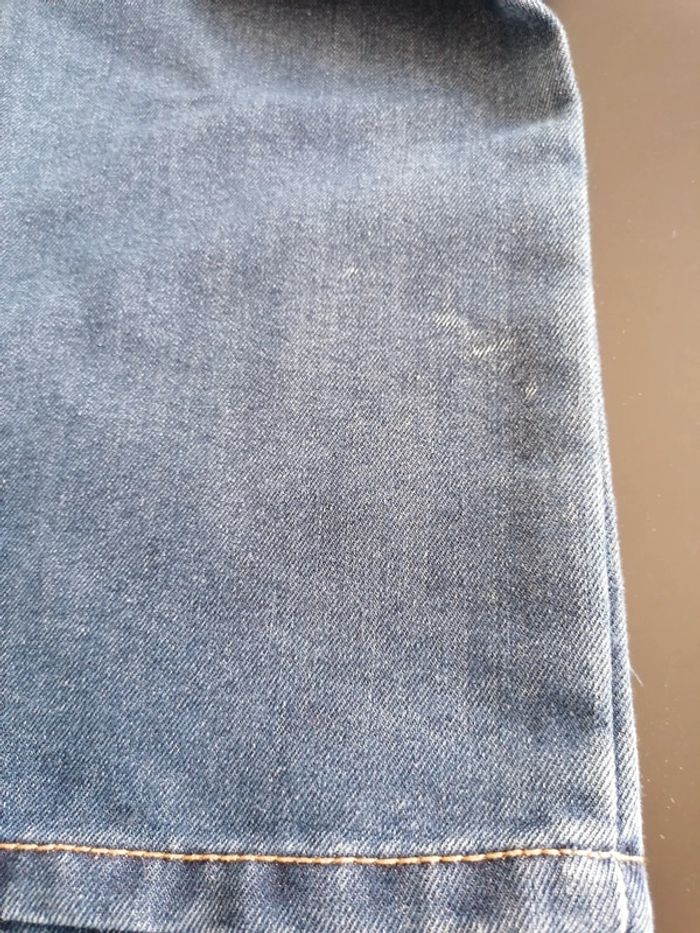 À des tâches blanches façon délavé sur les 2 jambes (acheté comme ça) et une ligne de "décousu" (voir photos)