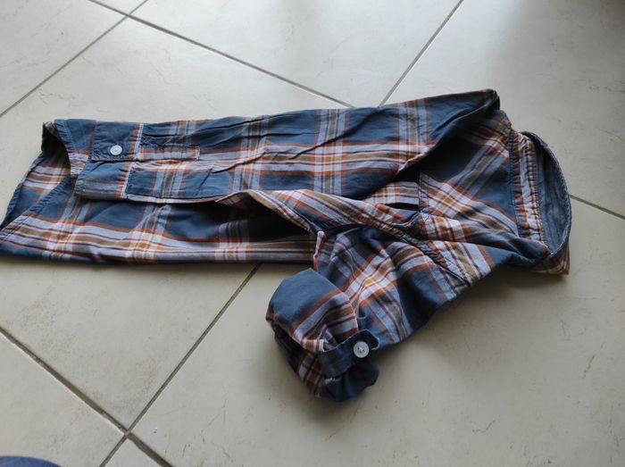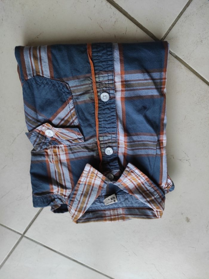 Chemise à manches longues 8 ans tape à l'oeil. Les manches peuvent se tourner et s'accrocher pour être plus courtes . Neuve jamais mise. J'ai d'autres chemises ainsi que d'autres habits en 8 ans garçon photos possibles